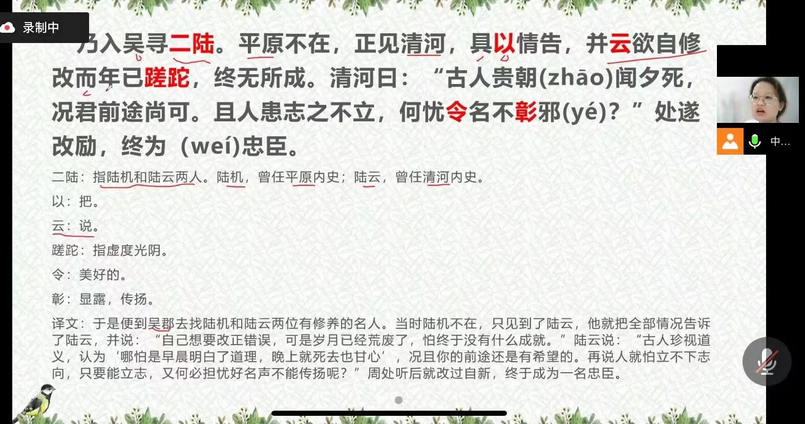 志愿者们借助腾讯会议,围绕“周处除三害”展开了详细的讲解。志愿者们首先简单介绍了周处的人物背景,随后通过朗读课文的形式纠正同学们的读音问题。课堂上,志愿者采取重点标红、易读错字反复强调、字字落实翻译、随机抽取同学提问等方法为同学们细致地讲解课文。在课程的最后,水果派av