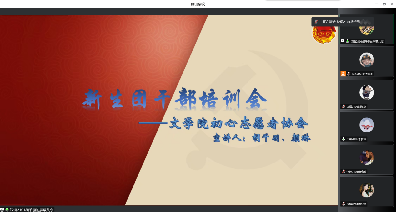 会议伊始,李梦瑶介绍了本次会议的主要目的及内容。随后,文体活动部负责人杨智莹针对文艺活动和体育活动两个方面为团干部进行关于部门简介、部门职责、部门工作要点和举办活动流程等内容的阐述。学业发展部负责人陈锦锦介绍了暑期“三下乡”、寒假“返家乡”社会实践的主要内容及立项、结项的相关流程,鼓励大家积极参与社会实践活动。秘书部负责人刘加杰对学生权益的主要内容及维护方法进行讲述。他在会议上强调了习近平总书记对中国共产主义青年团期望与嘱托,并进一步对共青团组织参与公共服务的定位、职责、做法、成效等展开介绍。初心志愿者协会负责人胡千羽围绕志愿服务机制建设、志愿服务项目策划、志愿服务组织建设、志愿服务经验分享及经历交流四个方面,向大家介绍志愿服务的主要工作,增强大家参与志愿活动的积极性。