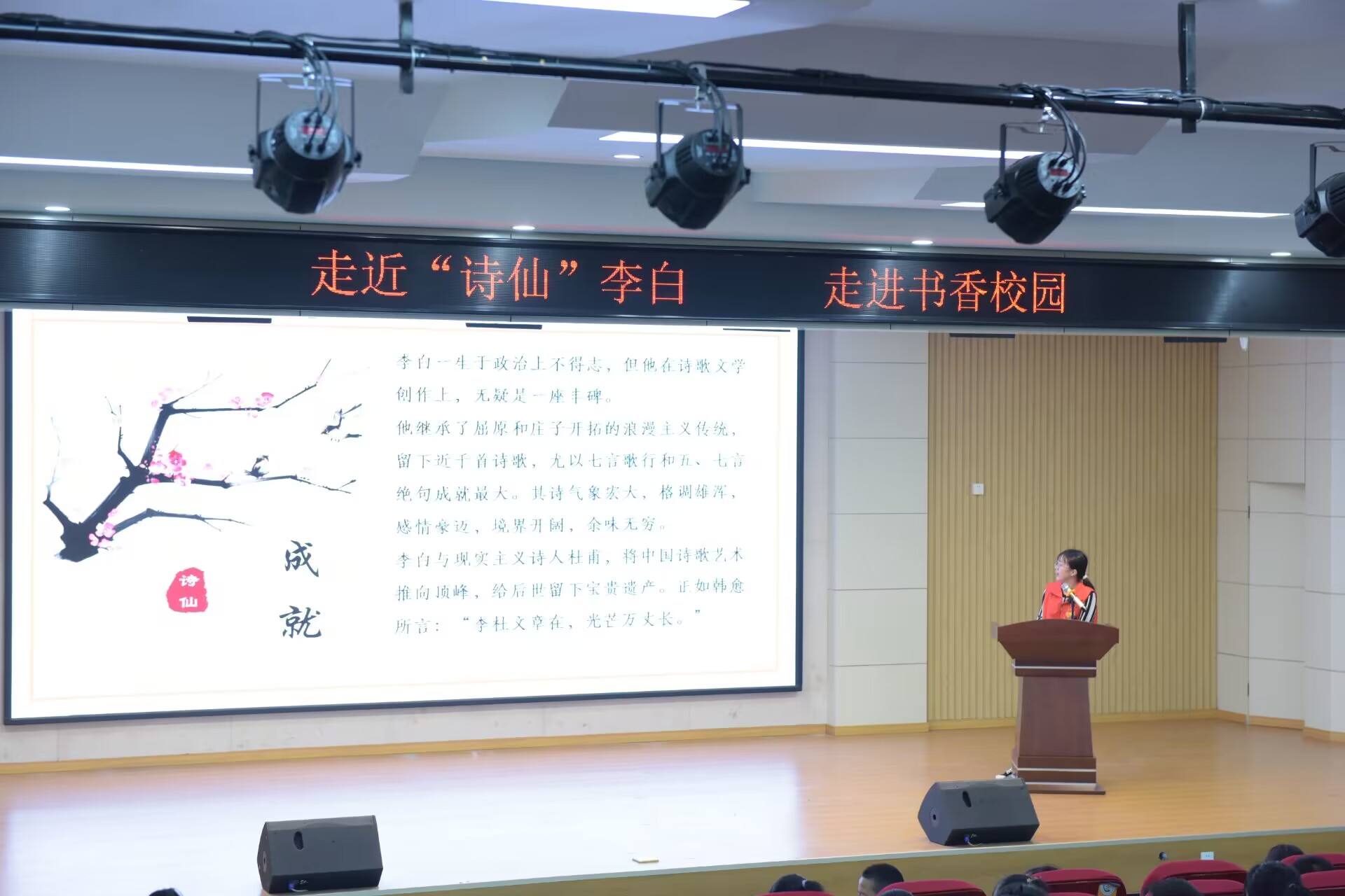活动开始前,志愿者们查阅资料,制作PPT,围绕“诗仙李白”这个主题,做好了充分准备。活动中,志愿者通过提出小问题引入本次授课的主题,引起小朋友们的兴趣。接着,志愿者分别从李白的生平、诗歌、成就等角度讲解了与李白有关的文化知识,期间辅以课堂小提问等形式,吸引小朋友们的注意力,加深小朋友们的印象,力求使小朋友们更加深入的理解李白的生平。最后,志愿者引导小朋友们回顾知识,加深记忆。活动结束后,小朋友们为志愿者献上了热烈的掌声。