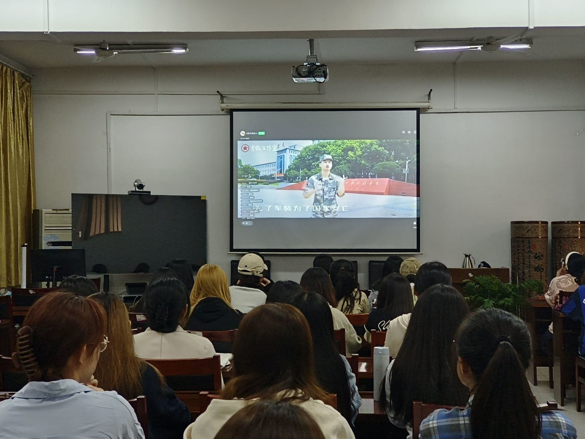 学生会进行播放设备的调试和人员参加情况的统计,并通过线上QQ群的方式及时向参加的同学传递相关的信息。活动中期,水果派av