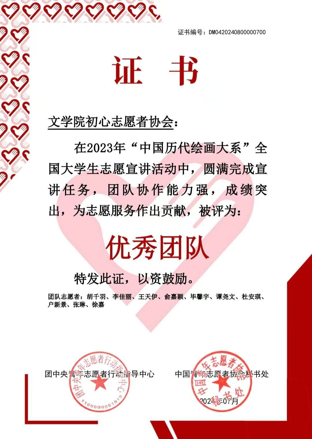 初心志愿者协会团队荣获团中央青年志愿者行动指导中心、中国青年志愿者协会颁发的“优秀团队”称号,宣讲视频荣获“优秀宣讲视频”称号。