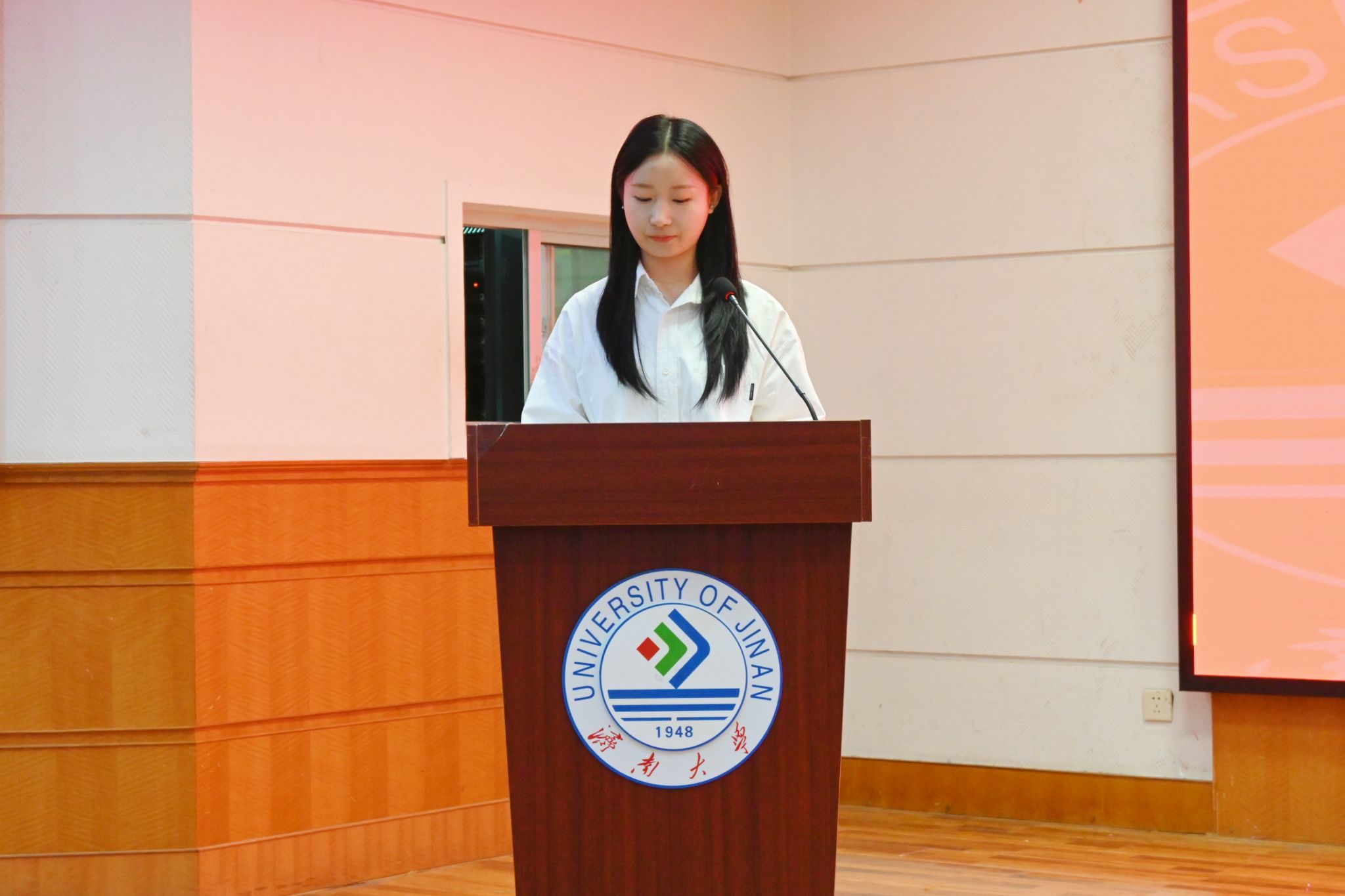 研究生杜滨慧发言,她感谢了学院的悉心栽培及圣儒教育的深切关照,表示一定深耕学术之壤,厚植家国情怀,将个人小我融入时代大我,不负韶华,不负期许,书写笃行奋进青春华章。
