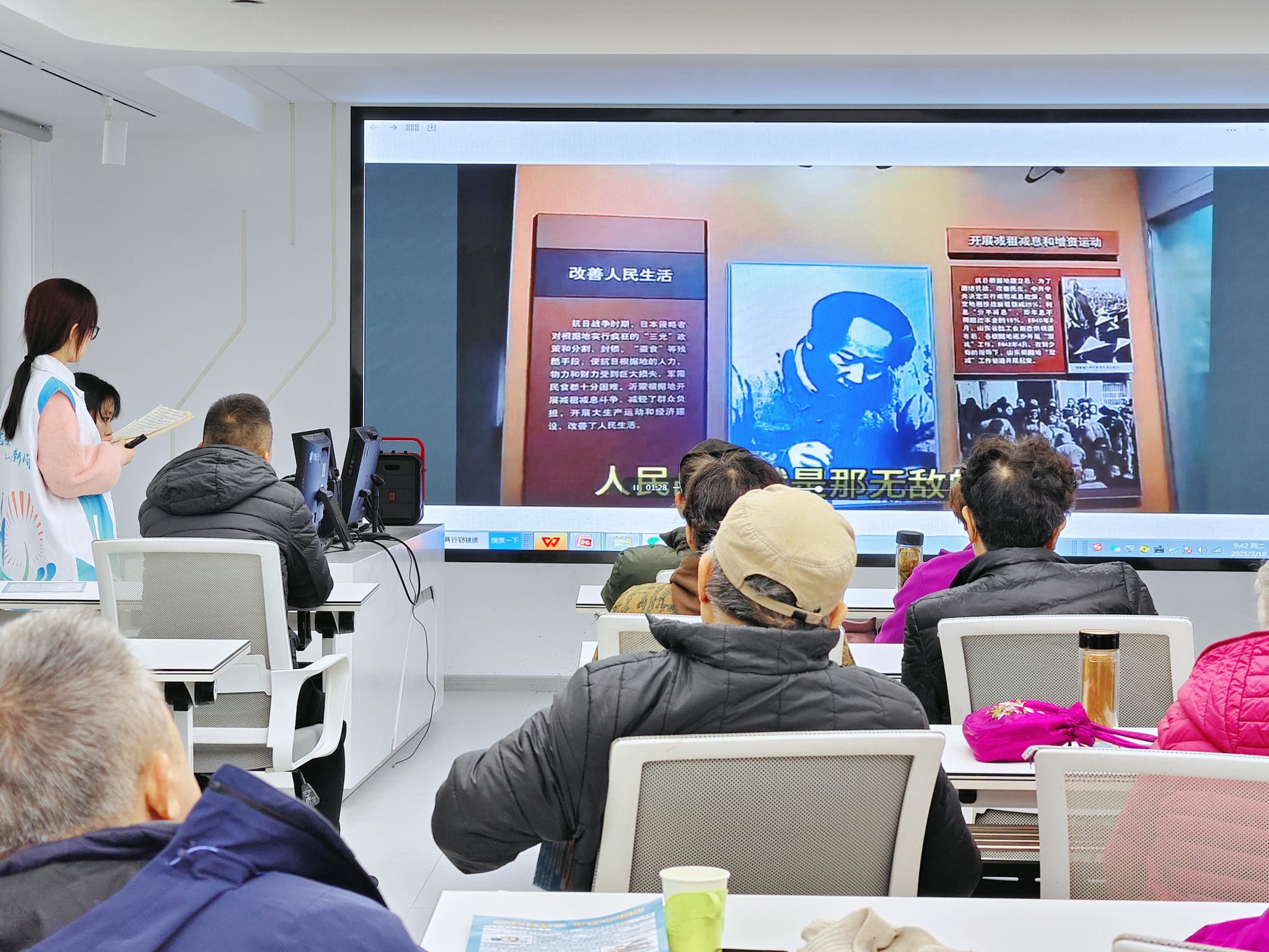 宣讲团结合现代技术,通过“云游览”的方式带领党员们走进沂蒙革命纪念馆、沂蒙红嫂纪念馆等历史地标。穿插讲述的沂蒙故事简短却感人至深:红嫂用乳汁救助伤员、百姓肩挑背扛运送军粮……这些片段生动地诠释了沂蒙人民的无畏与坚韧,令老党员们为之动容。