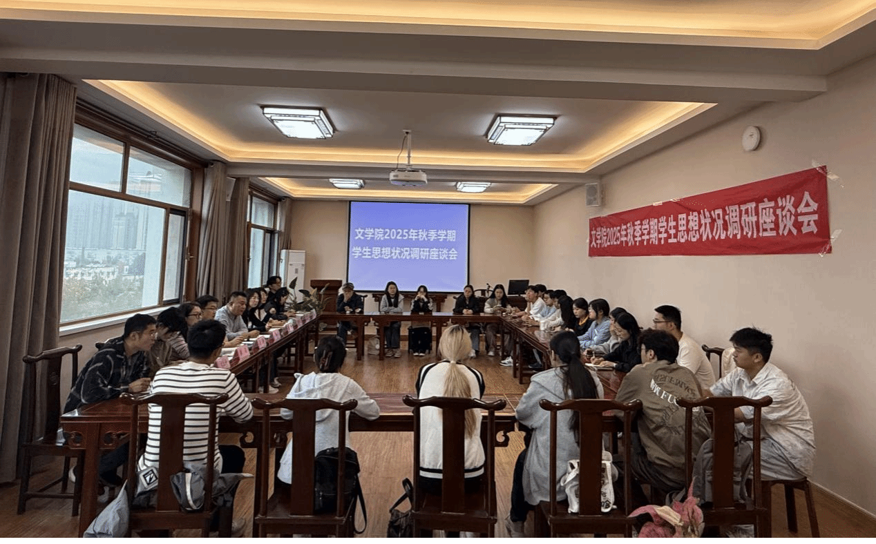 在第三教学楼419室专题召开2025年秋季学期学生思想状况调研座谈会。学院党委书记朱海龙,党委副书记、副院长潘颖出席会议,全体辅导员,教学管理办公室相关工作人员,以及各年级学生代表共同参与座谈会。