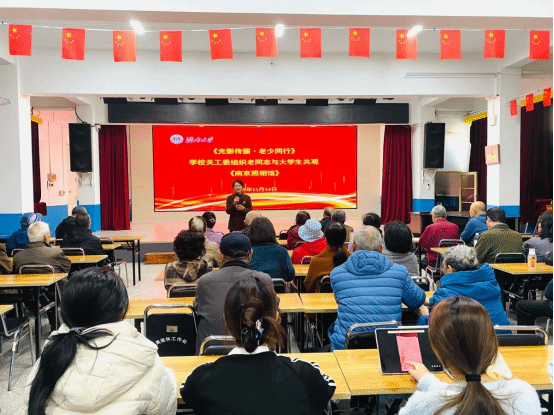 学生代表与离退休老同志共同观看爱国主义教育影片《南京照相馆》。学校关心下一代工作委员会秘书长、离退休工作处处长高卫红主持活动并讲话。