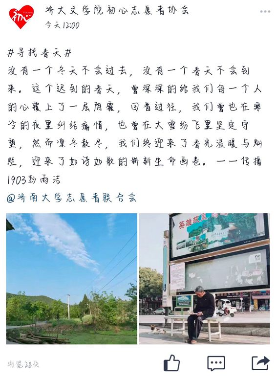 初心志愿者协会的志愿者们自行组织起“寻找春天”活动,寻找各自家乡的春天,并拍摄照片,进行展示。因疫情影响,此活动于线上进行。