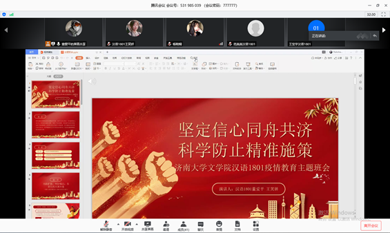 此次活动以班级、党支部和团支部为单位,开展疫情防控网络思政教育主题班会、支部会、主题党日和主题团日活动。活动主题紧紧围绕“坚定信心、同舟共济、科学防治、精准施策”的十六字方针,主要内容包括理想信念和爱国教育、防疫知识和生命健康教育、法律法规和校规校纪教育三个方面。活动特别强调在防控形势向好的当下要加强思想建设、做好个人防护措施,不信谣不传谣,加强社会责任和感恩担当教育,心理健康、生涯规划和就业指导教育以及应急处置流程规范教育,坚决打赢此次疫情防控攻坚战。在活动中,各班班委为同学们讲解相关内容、播放相关的短视频,部分同学也和大家分享了自己在疫情期间的感受。同学们在活动中认真学习、积极发言,对相关问题进行探讨和交流,并表达了对战胜疫情的信心,他们也一致表示将听从国家和学校的安排,积极应对疫情,做好安全防护。
