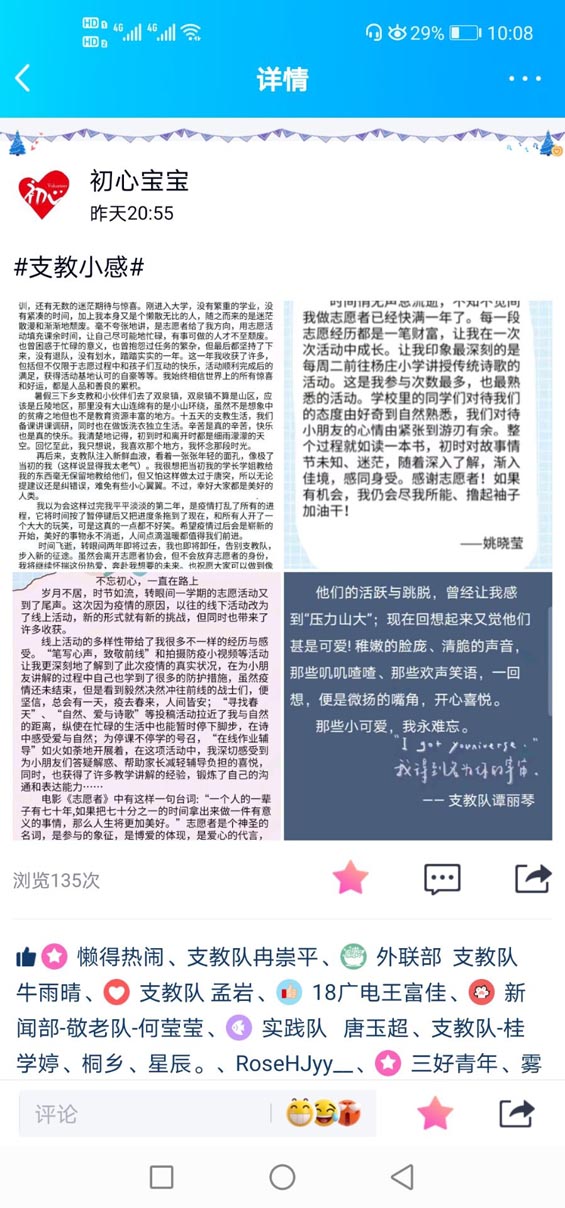 疫情仍阻挡不了爱与温情的传递。本次线上志愿活动,首先由两位志愿者规划了本次活动的流程,发布活动召集投稿。志愿者将自己在支教过程中的感受于周二下午两点之前发送至活动策划人。经志愿者进行编辑排版制成图片后,统一发给水果派av