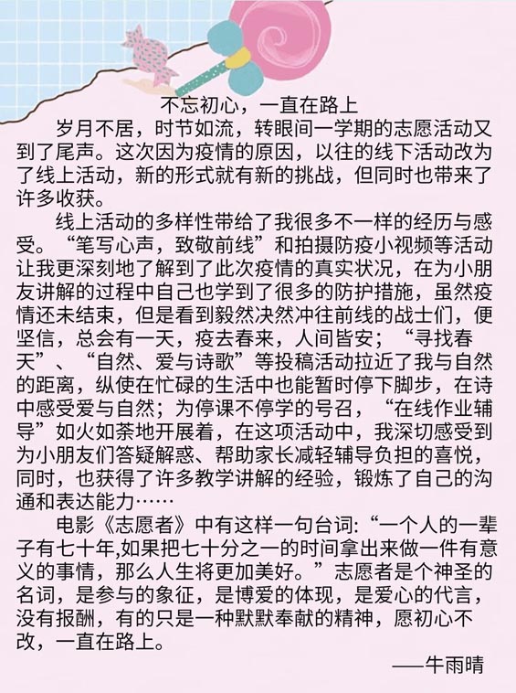 志愿者于5月26日进行了“回忆支教”投稿活动,分享自己在志愿活动中的难忘际遇以及心得。