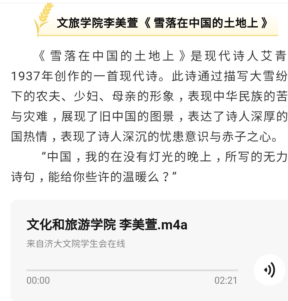 刘晓倩将《采桑子》小说向我们娓娓道来,小说中写没落而不衰败,叹沧桑终能释怀的气氛萦绕耳畔;文旅学院李美萱用激昂的语调展现了艾青那深沉的忧患意识与赤子之心,领读人活动促使听众用朗读爱上阅读,有助于提升学生阅读兴趣,激发阅读热情。