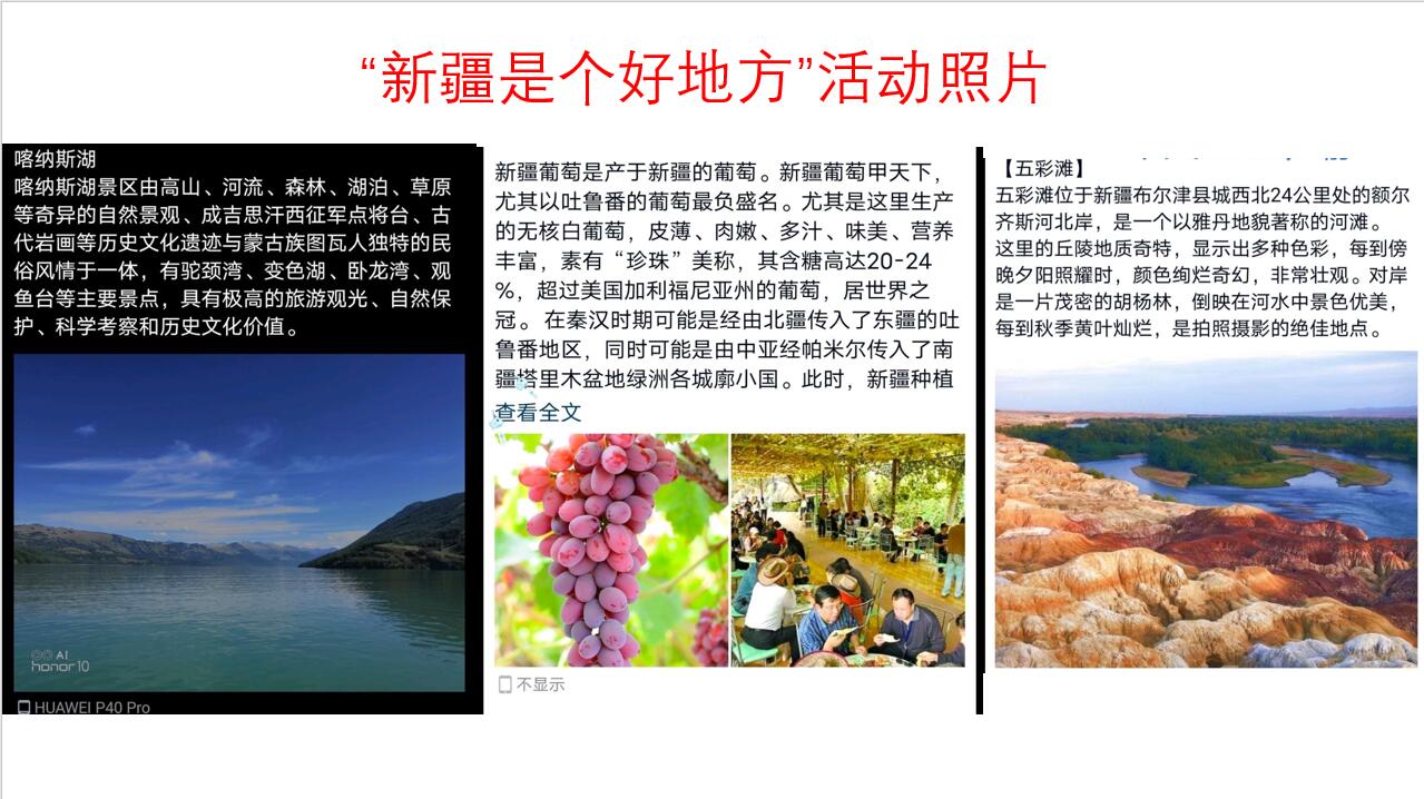 活动如期举行,引起了各个学院同学的关注。同学们积极参与,通过图文并茂的方式提交作品,宣传新疆的美景、美食以及文化遗产,将新疆的迷人景色、美好蓝图展现出来,让更多的人了解新疆、爱上新疆。活动结束后,负责人精心筛选了优质的投稿截图,并进行了整合发布。
