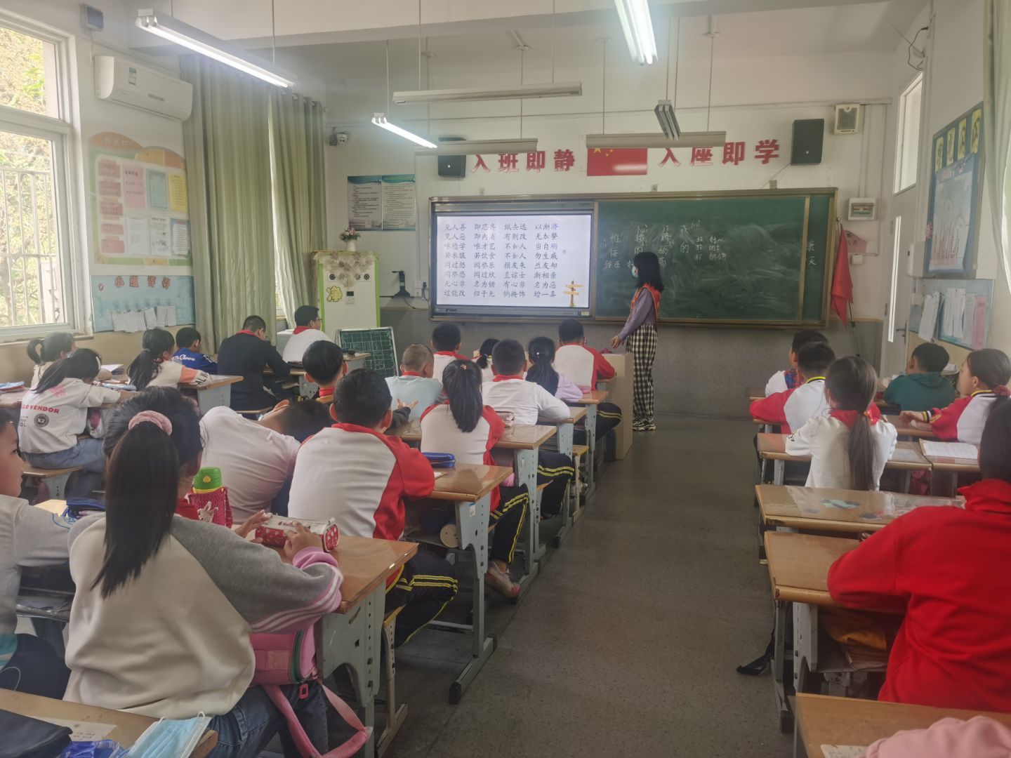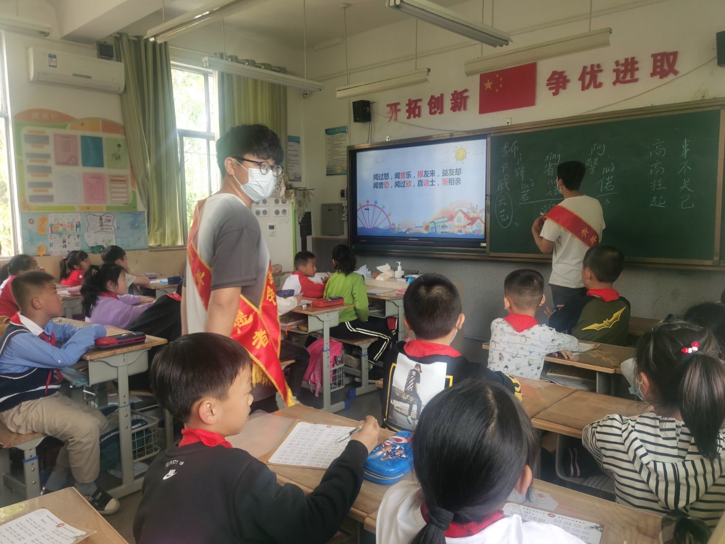 活动开始前,志愿们充分宣传、积极参与,并根据参与人数进行了任务分配。活动准备期间,志愿者们认真备课,根据各个年级学生理解能力的不同选择了不同的教学方式,力求充分调动他们的课堂积极性并对课堂进度进行合理规划。活动进行时,一个志愿者利用多媒体进行授课,主要讲解《弟子规》第三章《出则悌》的内容与重点字词,详细且有重点地解释文章大意;另一个志愿者主要负责维持课堂纪律,推动课堂进度,通过加分或小奖品奖励等措施充分调动学生们的课堂积极性。在课堂上,志愿者们通过采用齐读、男女对比朗读等形式来加深学生对文章本身的理解,同时形成良性竞争提高同学们的参与度和投入度,同时还通过讲述与教学内容相关历史典故,例如孔融让梨,卜式让弟等的形式,引导学生领悟“入则悌”的真谛,以期达到学以致用的最终目的。