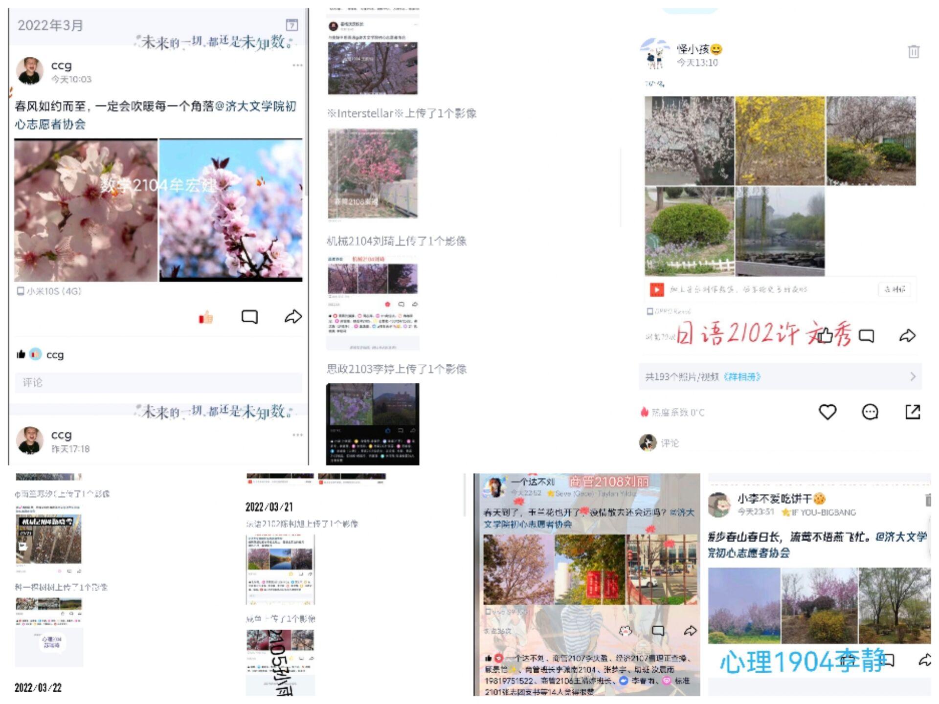 初心志愿者协会账号上发布通知进行宣传,吸引了众多同学加入。受志愿者们的鼓舞,大家纷纷用照片记录校园内的春日图景,并配上一段段展望未来生活的文案,在QQ空间以动态的形式发布。健康的心态是疫情防控的心理口罩,本次活动的最大亮点在于引导大家感受美好春日的同时,也大大增强了同学们抗击新冠肺炎疫情的信心,坚定了积极乐观的生活态度。活动结束后,志愿者们进行了复盘与总结,并提出建议来不断完善服务工作。
