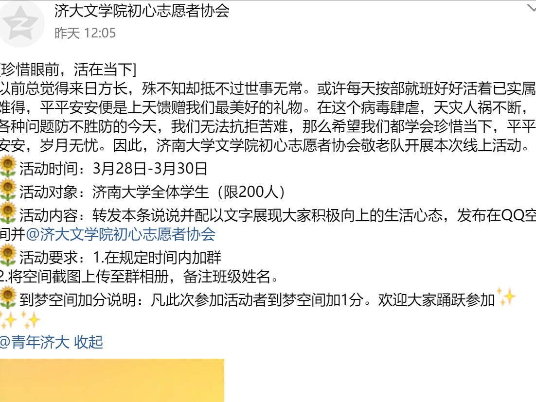 “时代的一粒灰,落在每个人的头上,就是一座山。”秉持着这一宗旨,初心志愿者协会在活动策划期间紧跟时事,确立了“乐观生活,传递温暖”的活动主题。活动过程中,志愿者们广泛宣传,吸引了大量同学参与其中,得到强烈反响。同学们积极留言,纷纷写下了自己对近期生活的感悟,分享快门里的春日风景以及备忘录里的书摘等,传递了温暖和正能量,同时让也同学们更加乐观包容的对待特殊时期的生活。