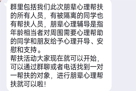 心理协会于2022年4月20日在校内举行“宿舍隔离同学一对一朋辈帮扶”活动,该活动面向学生公寓17号楼全体同学,旨在对隔离同学进行心理疏导,帮助同学健康安心学习、生活。