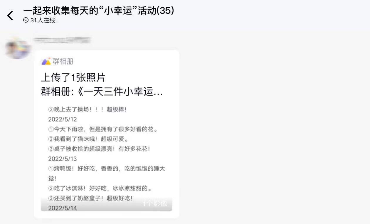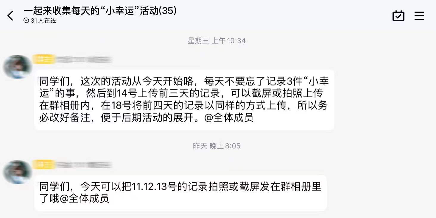 活动开始之前,工作人员在活动群具体说明了活动规则和详细流程,之后正式下发通知宣布活动开始。心协工作人员全程监控活动进行,耐心负责统计备注,与此同时,同学们按照规则每天都记录好当天的3件“小幸运”,并在活动群晒照分享。通过同学们分享的“小幸运”可以看出参与同学都在认真观察生活,记录琐碎,在每天四点一线的学习中发现美好,铭记幸运,以阳光、昂扬的姿态浇灭浮躁,应对孤独。活动结束后,心理协会工作人员统计好参与人员并宣告活动圆满结束。这样亲身参与和体验的心理活动令同学们感到放松、舒适,收获着点点滴滴的幸福与美好。