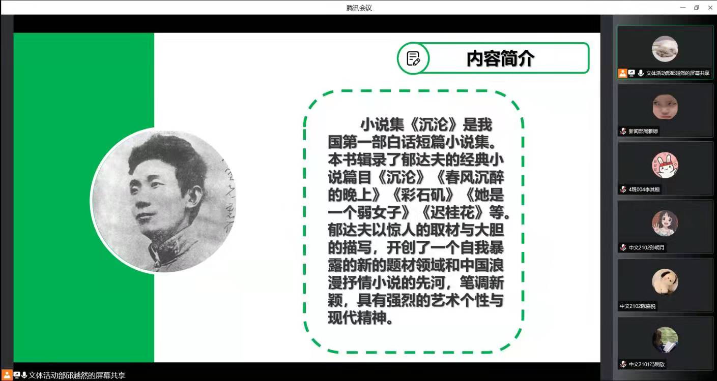 邱越然同学选择的书籍是《沉沦》,该书以有血有肉的人物形象,展示了当时青年人的苦闷,呼吁了对人性的解放。邱越然同学简单介绍了《沉沦》的作者郁达夫,并结合当时的时代背景分析了郁达夫的创作背景,详细地分析了主人公的病态心理和“沉沦”的原因,阐明了郁达夫以惊人的取材与大胆的描写,开创了一个自我暴露的新题材领域和中国浪漫抒情小说的先河。并讲述到自己从书中体会到青年人要敢于直面自我,解放自我,摆脱传统思想的束缚,活出自己的模样。邱越然同学表示本书所传递的思想是对我们大学生的一个指引,呼吁同学们深入阅读书籍,从书中汲取营养、受到启发,提高自身的综合素养。本次参与活动的同学也分享了自己的感受,在听讲解中感受到了郁达夫所展现的有所不幸、有所苦闷的浪漫主义,从中体会到了其笔调新颖的独特韵味和他强烈的艺术个性与现代精神,并表示读书分享活动为大家开阔了眼界,调动了自己的读书热情,期待下一次的读书分享。