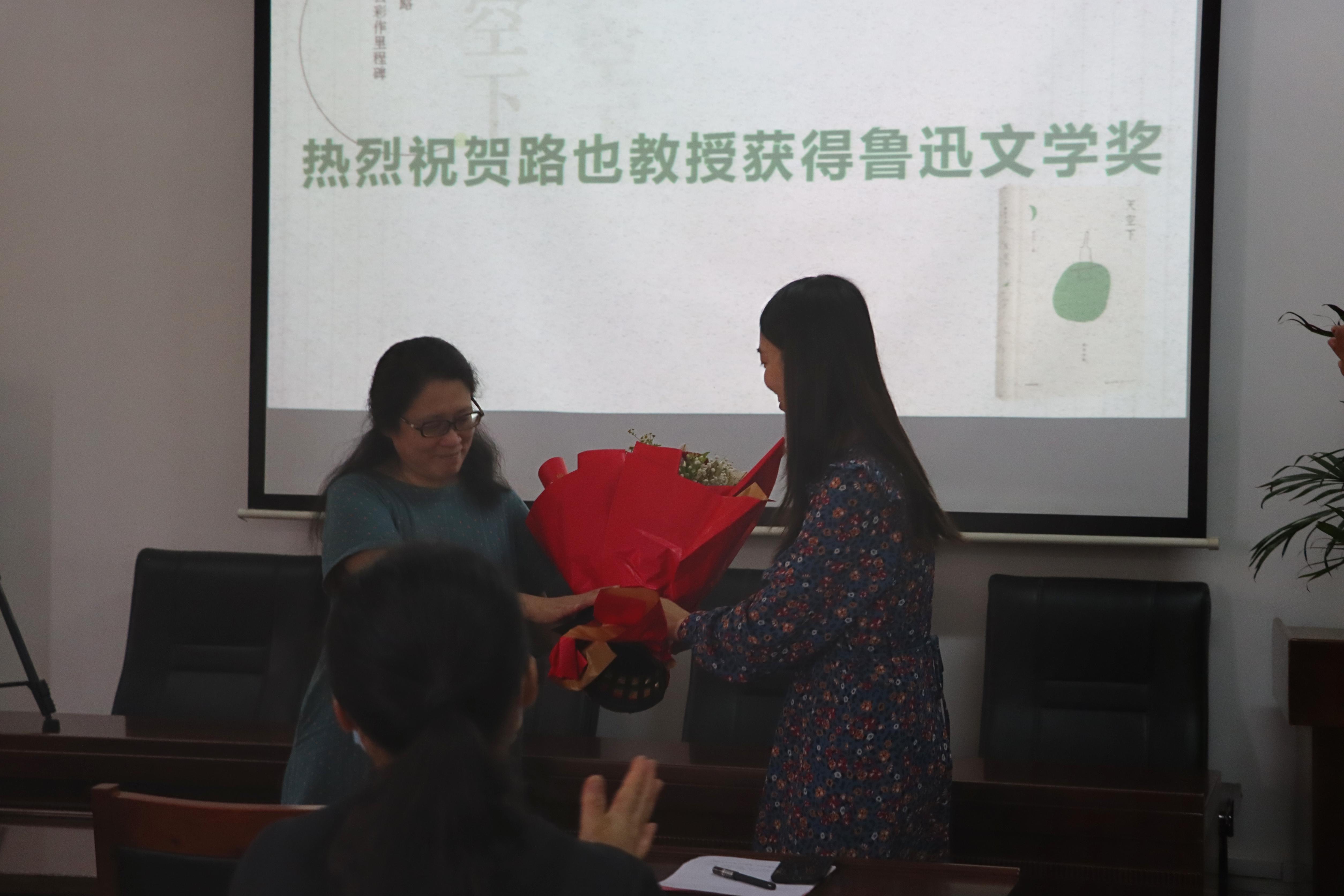 会上,路也教授向大家分享了创作心得,并表示“文学写作是我在这个世界上探索真理的一种方式,这是我喜欢的方式”。对于获奖,路也教授十分谦虚,她总结道:“获奖没什么特别值得说的,就是高兴、感激、激励。”平淡的语言中展现了她对文学始终如一的态度。最后,路也教授特意赠送给在场每一位教职工亲手签名的获奖作品《天空下》,共同分享喜悦。水果派av