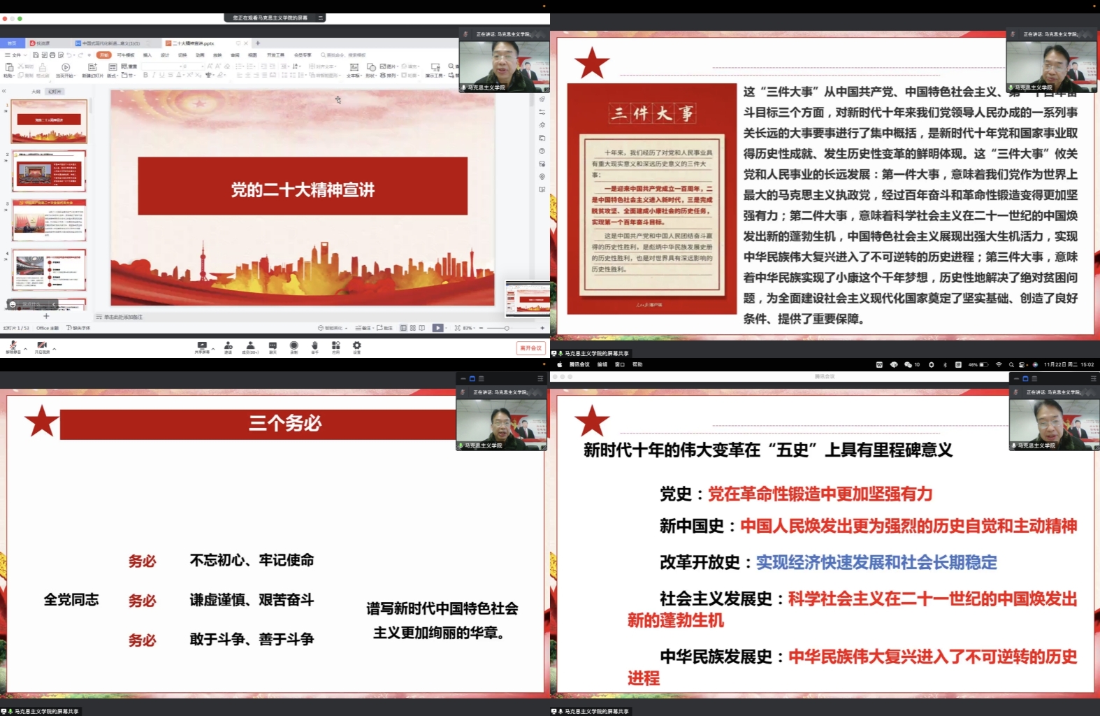 文洪朝教授从新时代十年成就推动我国迈上新征程、新时代新征程面临的机遇和挑战、开辟马克思主义中国化时代化新境界、以中国式现代化全面推进中华民族伟大复兴、以党的自我革命引领社会革命五个方面进行了二十大报告的解读,引导学院师生深刻理解了党的二十大精神。文教授重点强调了党的二十大的主题、主要成果,并指出要深刻领会过去五年的工作和新时代十年的伟大变革,深刻领会开辟马克思主义中国化时代化新境界,深刻领会中国式现代化,深刻领会全面建设社会主义现代化国家的目标任务,深刻领会坚持党的全面领导和全面从严治党的重大部署,要深刻领悟“两个确立”的决定性意义,增强“四个意识”,坚定“四个自信”,做到“两个维护”。