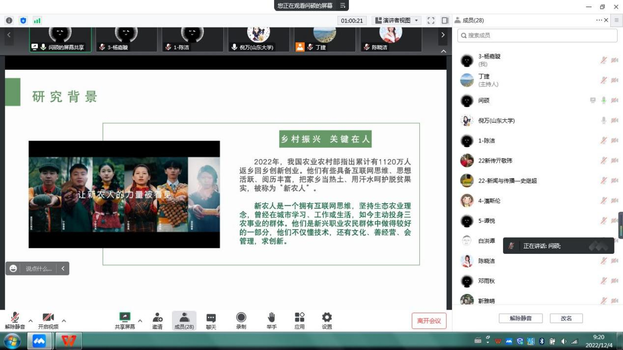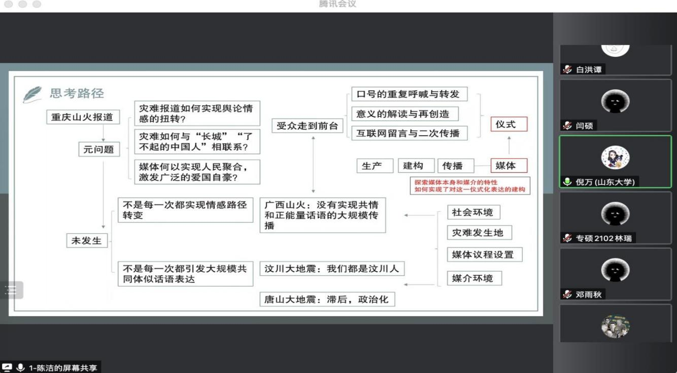 新闻与传播专业在线举行了2021级硕士研究生开题大会。山东大学新闻传播学院副院长倪万教授出席会议并担任评审组组长,新闻与传播专业硕士生导师、2021级和2022级研究生共计30余人参加了会议。会议由新闻与传播专业代理负责人丁捷老师主持。