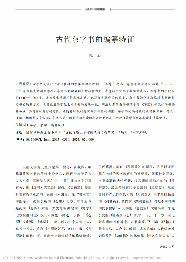 论文认为,杂字书是流行于古代乡村的重要的识字教材。“杂字”之名,包含着集合字词和对“三、百、千”系统补充的两层意思。杂字书的读者以乡村孩童为主,也包括文化水平较低的成人。杂字书的字数多为1000—3000字,是日常生活用字的客观反映,也符合实际学习的需要。杂字书的分类与编排主要借鉴类书的编纂方式,类目设置的变化也与类书的发展一致。明清时期的杂字书多参考《字汇》等流行字书编纂而成,其内容既具有稳定性,也随着时代的变化做出相应的调整。杂字书的编排技巧表现在谋篇、句式、注释、插图等多个方面。杂字书是中国蒙学识字读物丰富性的代表,对现代蒙学出版具有诸多借鉴价值。