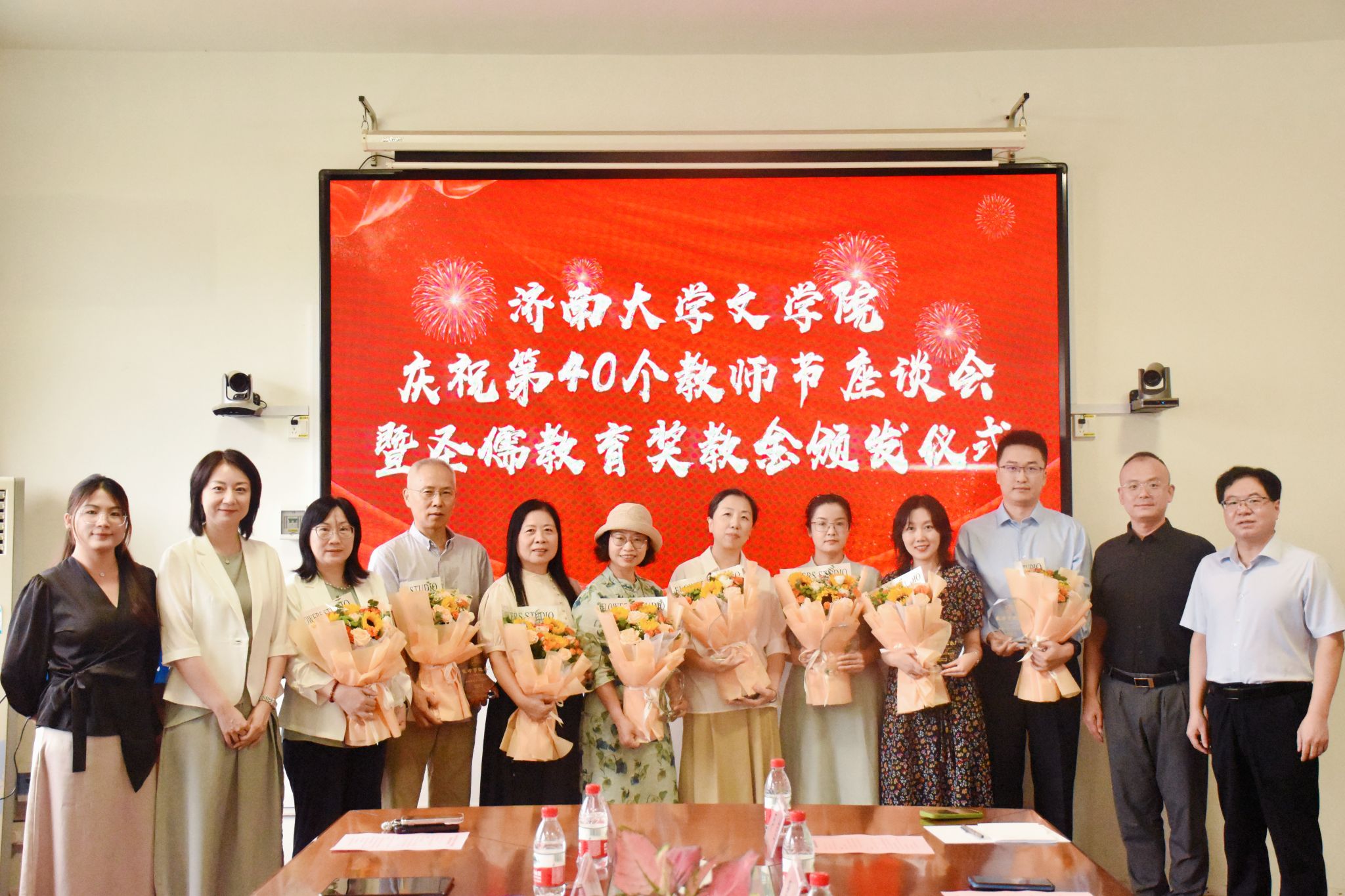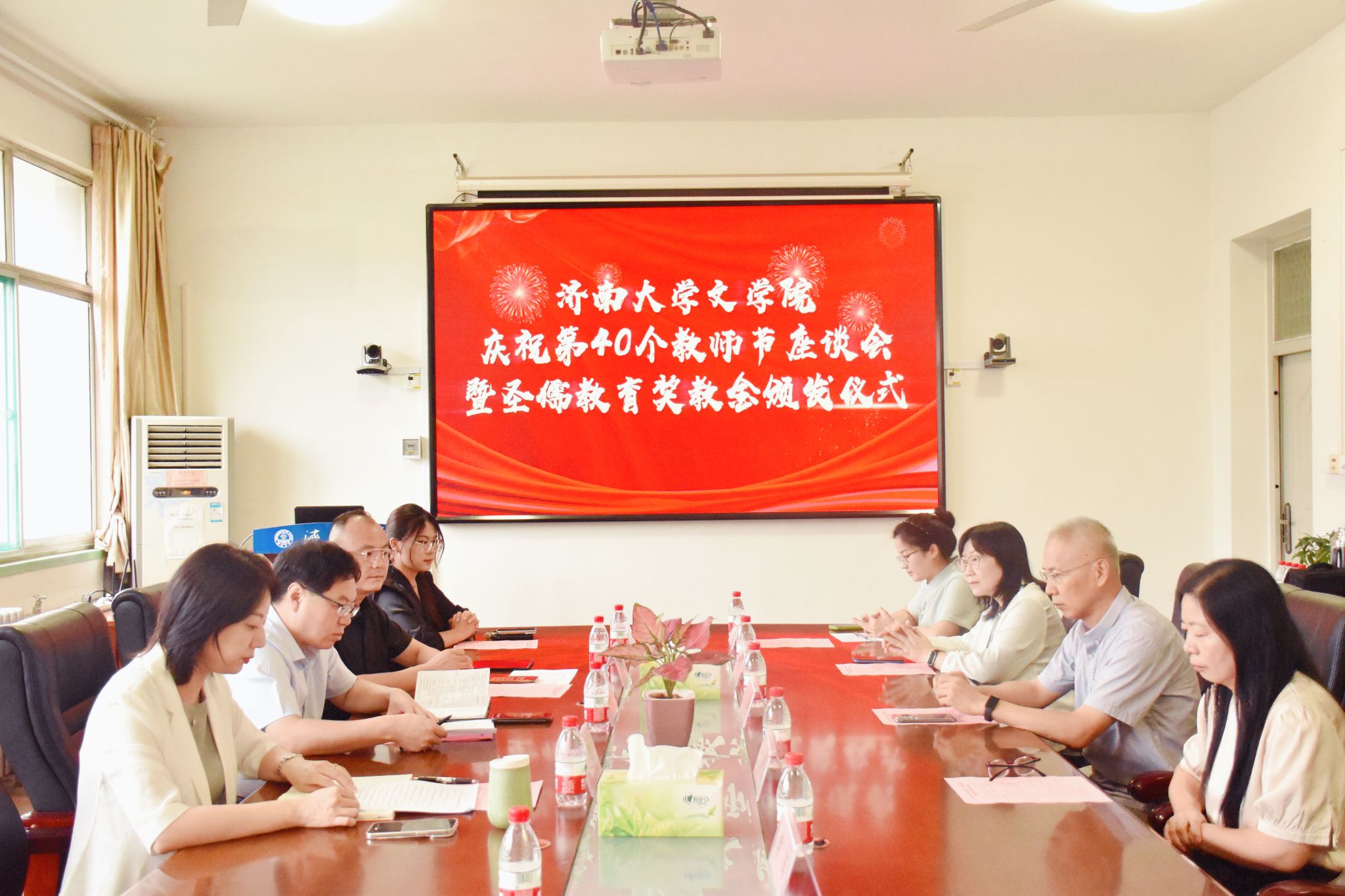 举行庆祝第40个教师节座谈会暨圣儒教育奖教金颁发仪式。学院党委书记董海军,圣儒恒信(山东)教育科技有限公司总裁王建伟、副总裁孟瑶,获奖教师代表等参加了会议。会议由学院党委副书记、副院长潘颖主持。