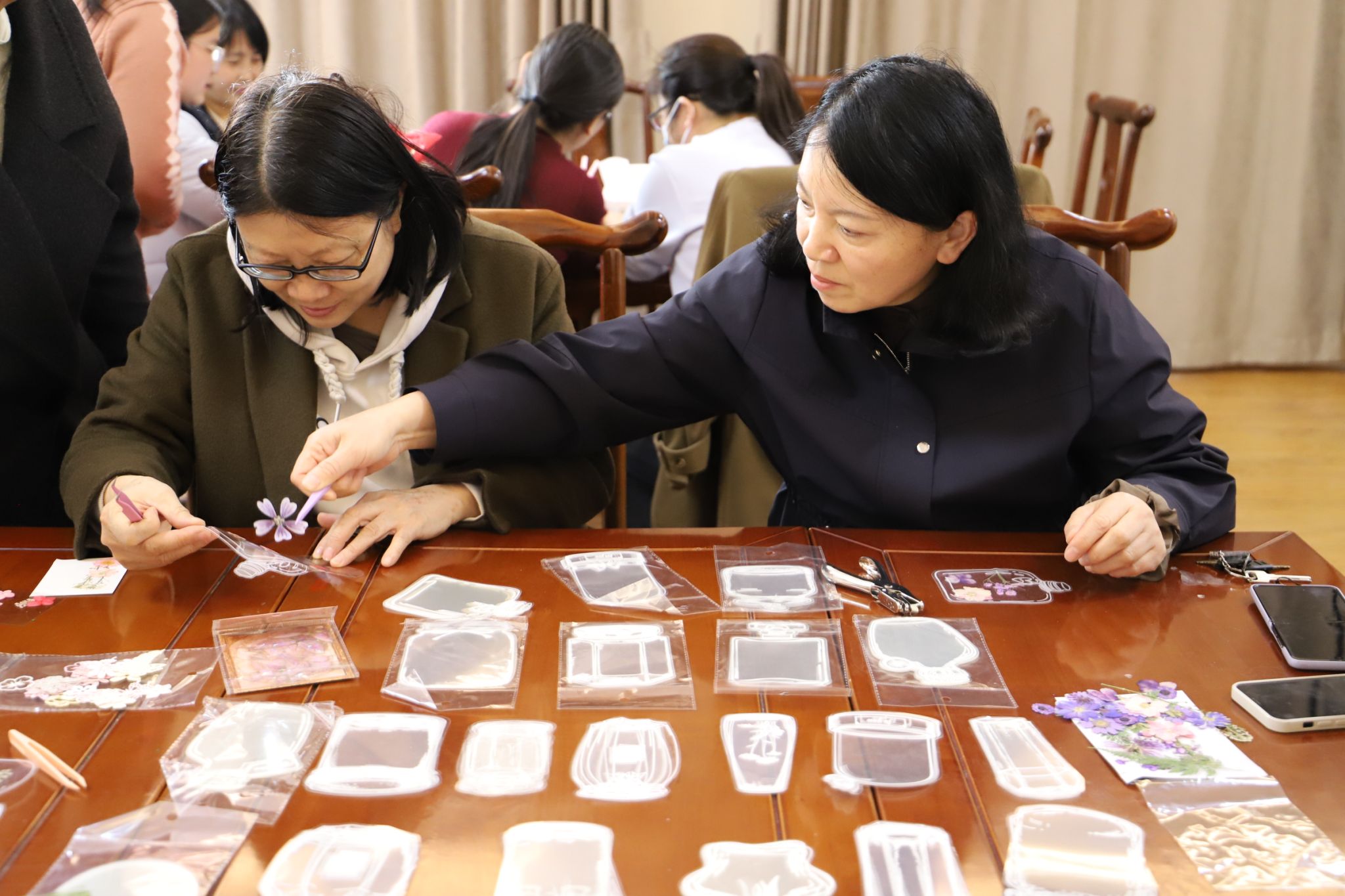 干花书签制作则充满了自然的气息,一朵朵干枯的花,在老师们的巧手下重新焕发生生机。每一片干花,都仿佛是一个女性的缩影,如象征果敢的木兰、寓意智慧的萱草等,诉说着她们的故事与品质。老师们将干花制作为书签,将满满的情感与祝福承载。