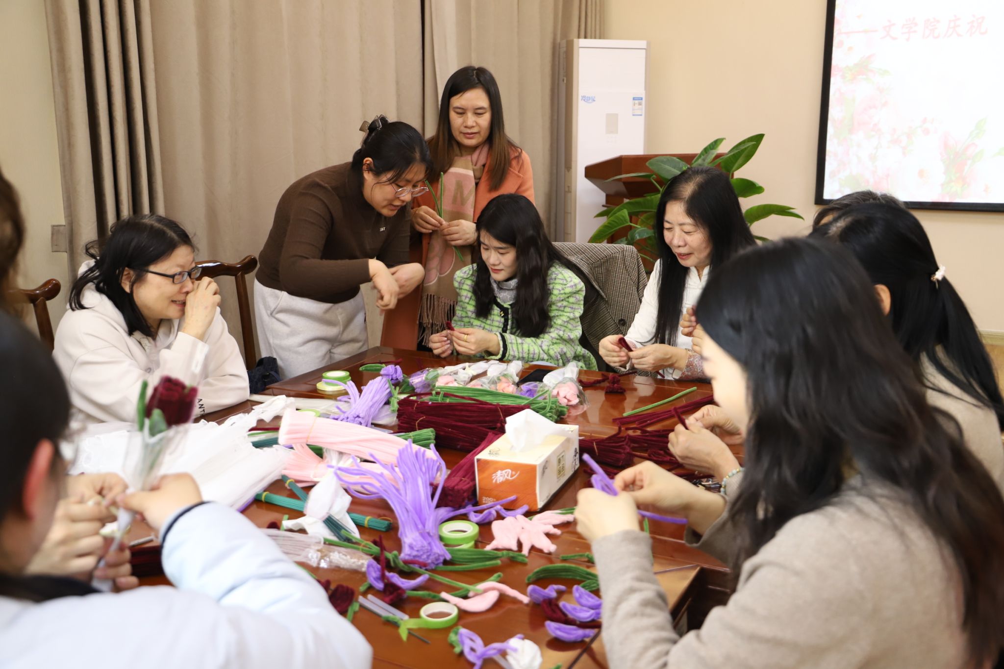 扭扭花是将传统的绒花工艺与现代扭扭棒相结合,老师们充分发挥创意,巧妙运用色彩缤纷的扭扭棒,折出了一朵朵精致漂亮的郁金香和玫瑰。在大家灵活的巧手下,看似普通的扭扭棒仿佛被注入了生命力,通过巧妙地弯折、缠绕,最终呈现出花朵优雅迷人的姿态。