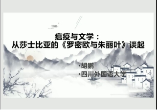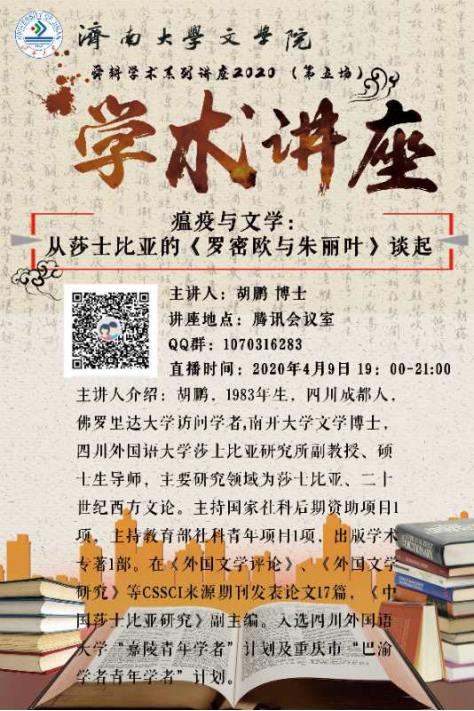 4月9日晚,“舜耕学术系列讲座2020”第五场如期举行。本期邀请到了佛罗里达大学访问学者、四川外国语大学莎士比亚研究所副教授胡鹏先生,讲座题目为《瘟疫与文学:从莎士比亚的<罗密欧与朱丽叶>谈起》。本次讲座采用腾讯课堂直播,水果派av