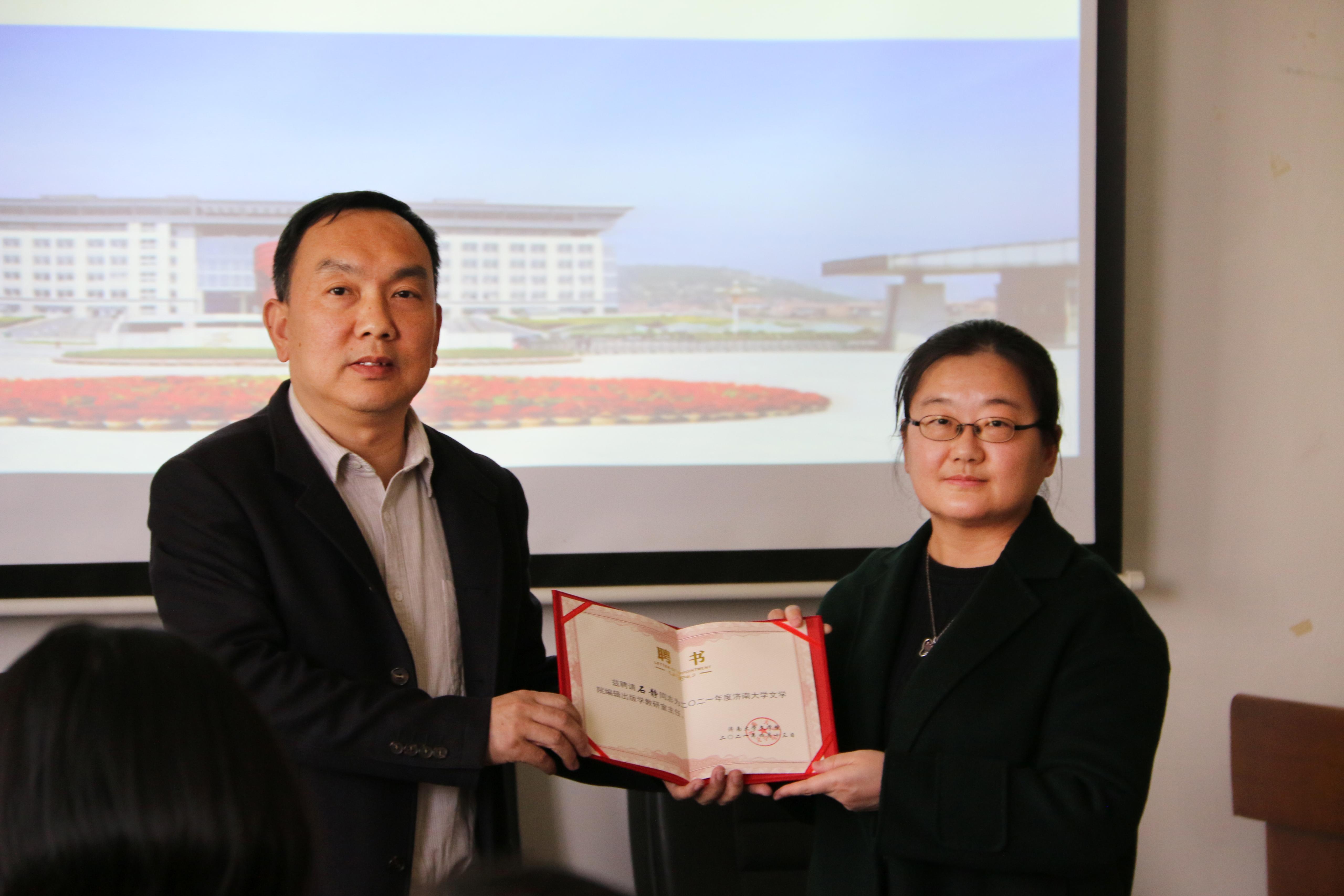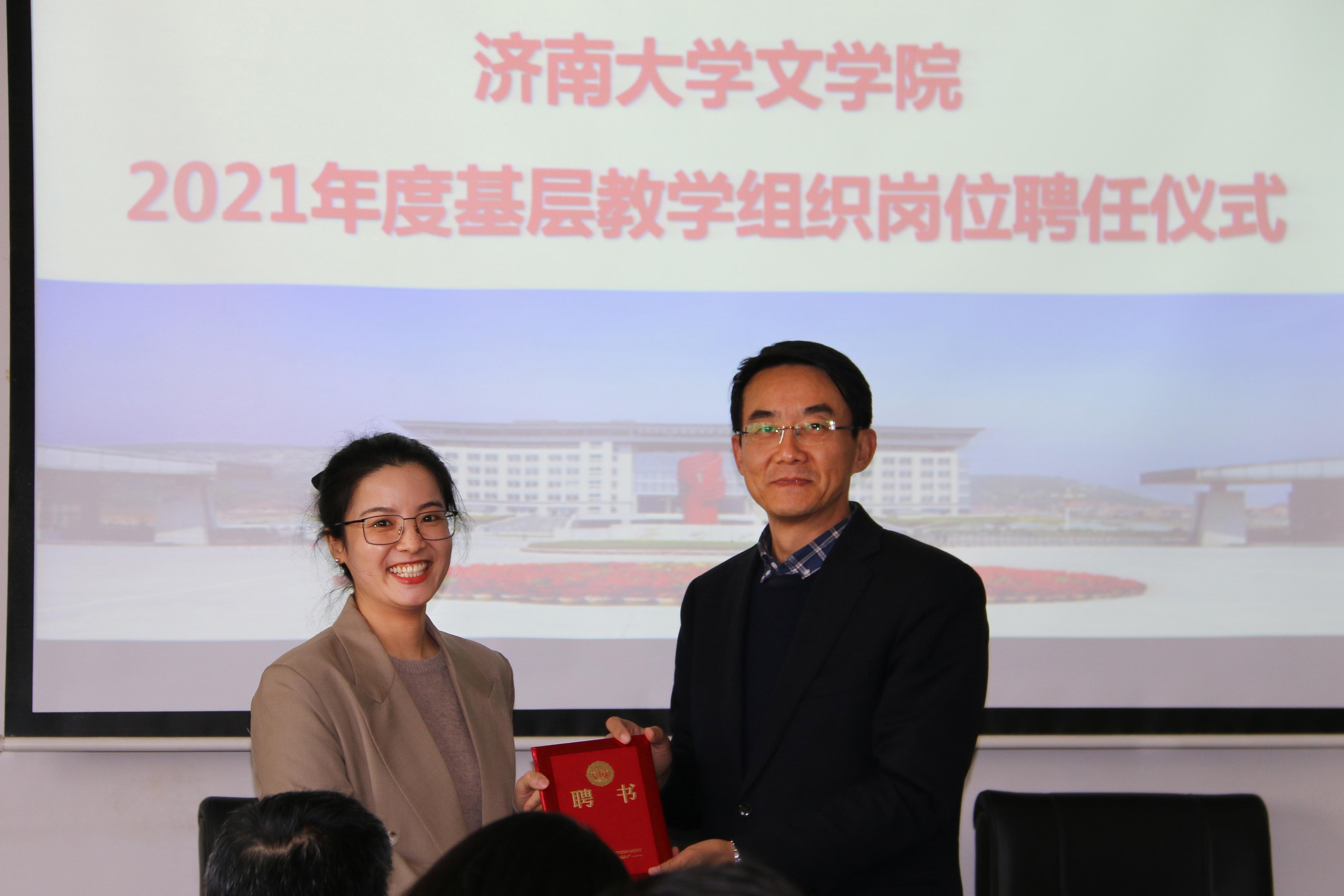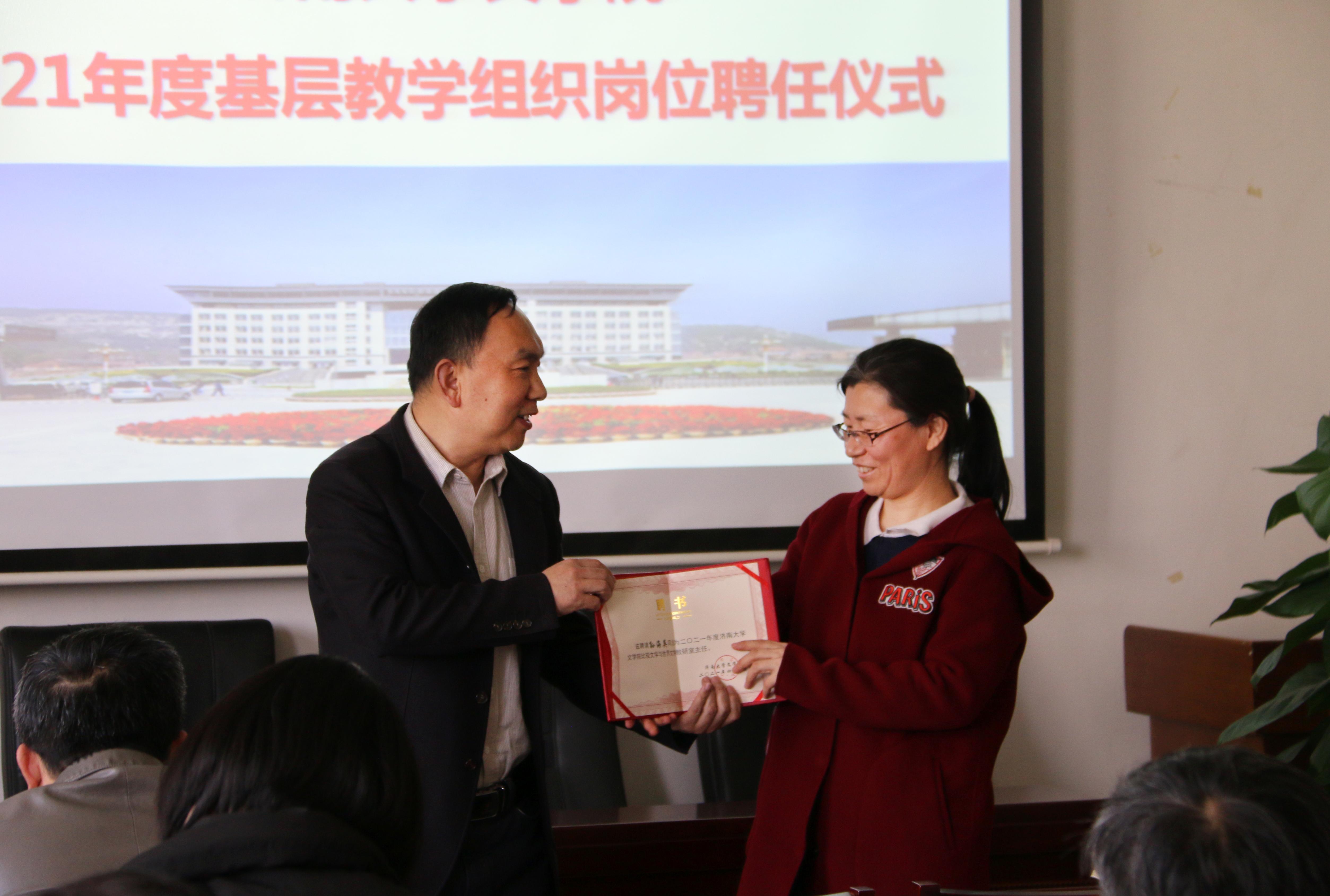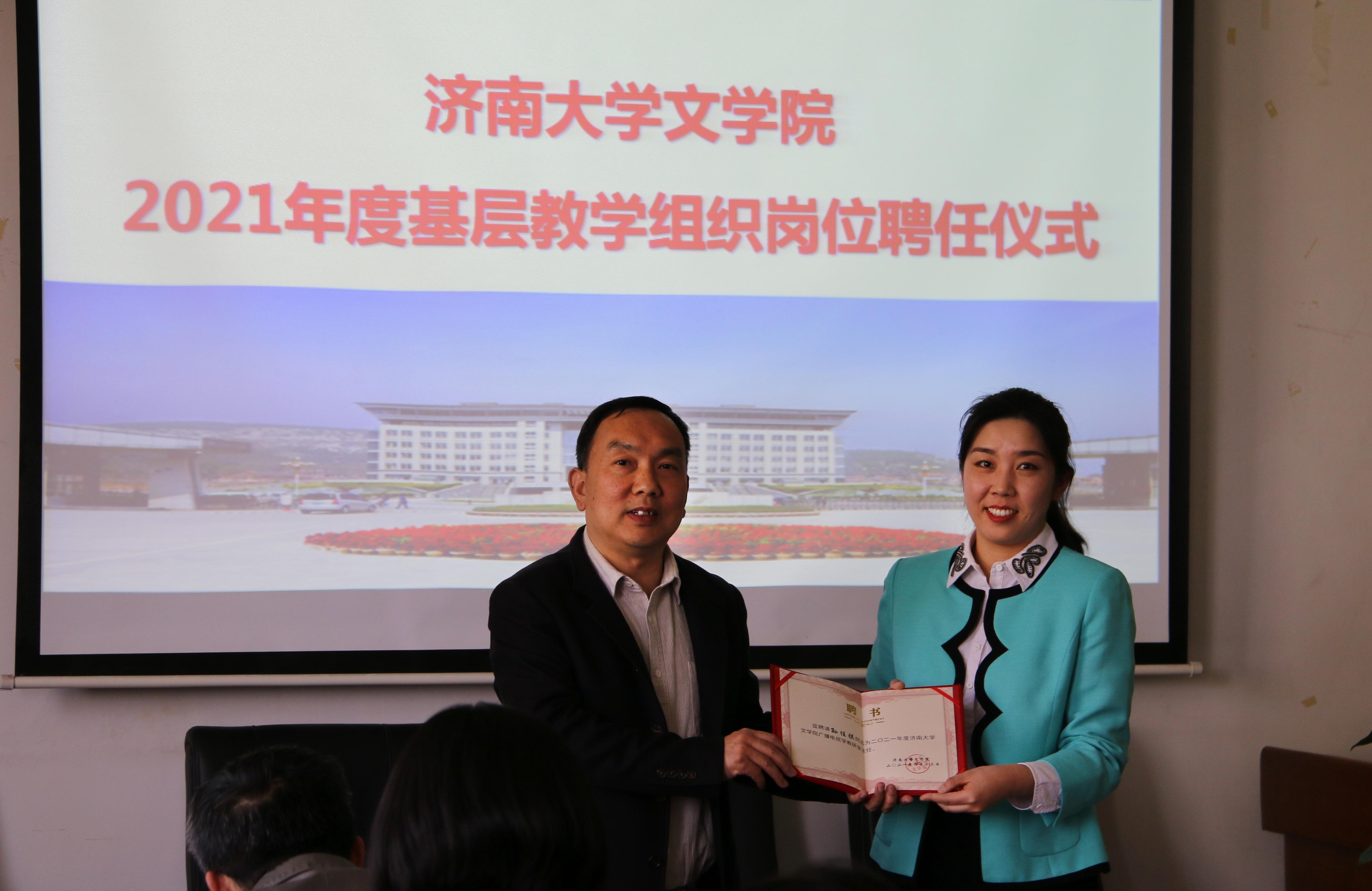 基层教学组织负责人聘任决定》,决定聘任王蓓等10人担任学院教研室主任、聘任蒋莹担任汉语言文学专业实践教学负责人,同时决定推荐张小平等4人分别担任汉语国际教育、广播电视学、广告学、编辑出版学专业负责人。随后,陈卫东书记、张兵院长分别向新聘任的教师颁发了聘书,并合影留念。至此,聘任仪式圆满结束。
