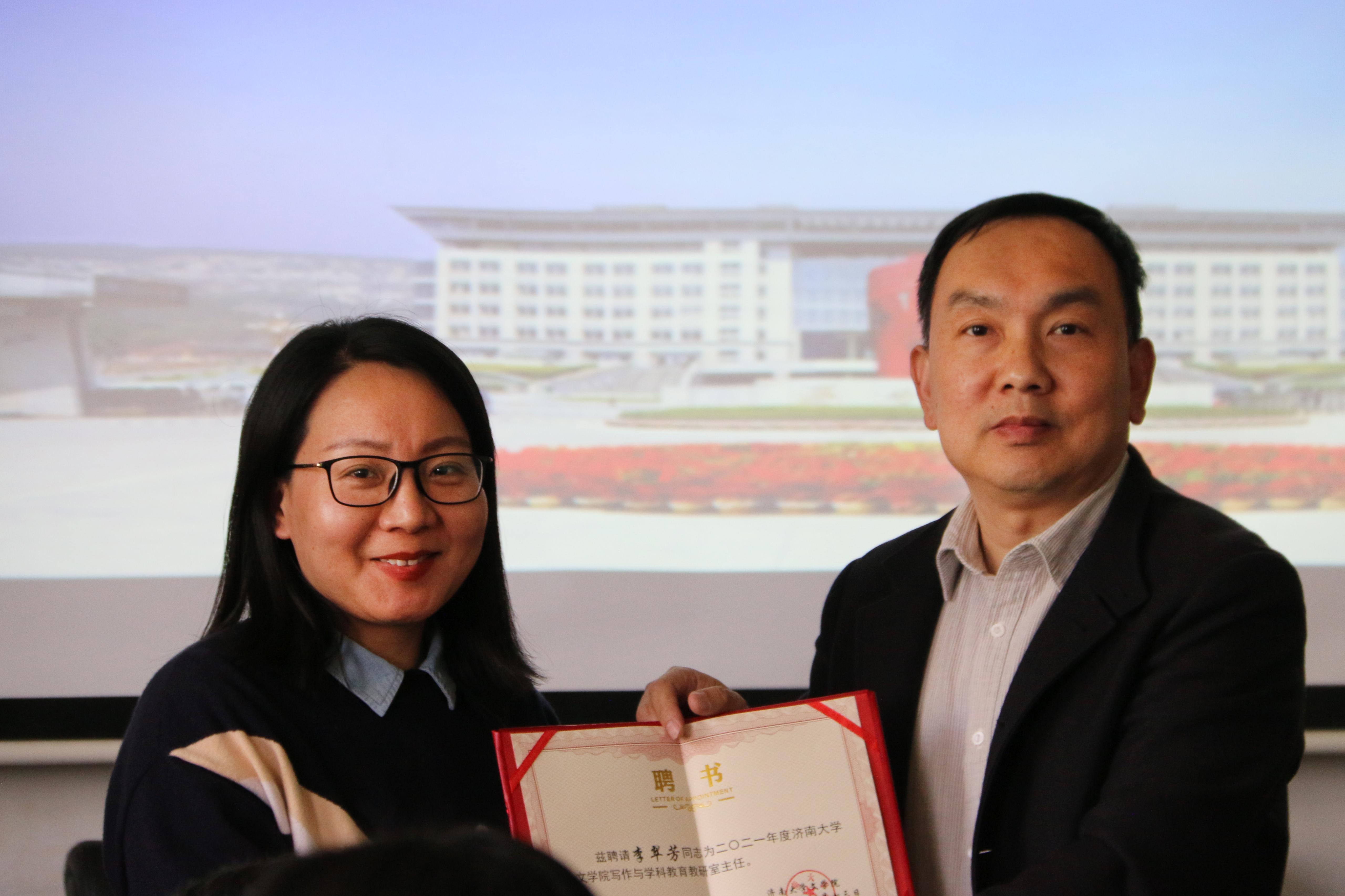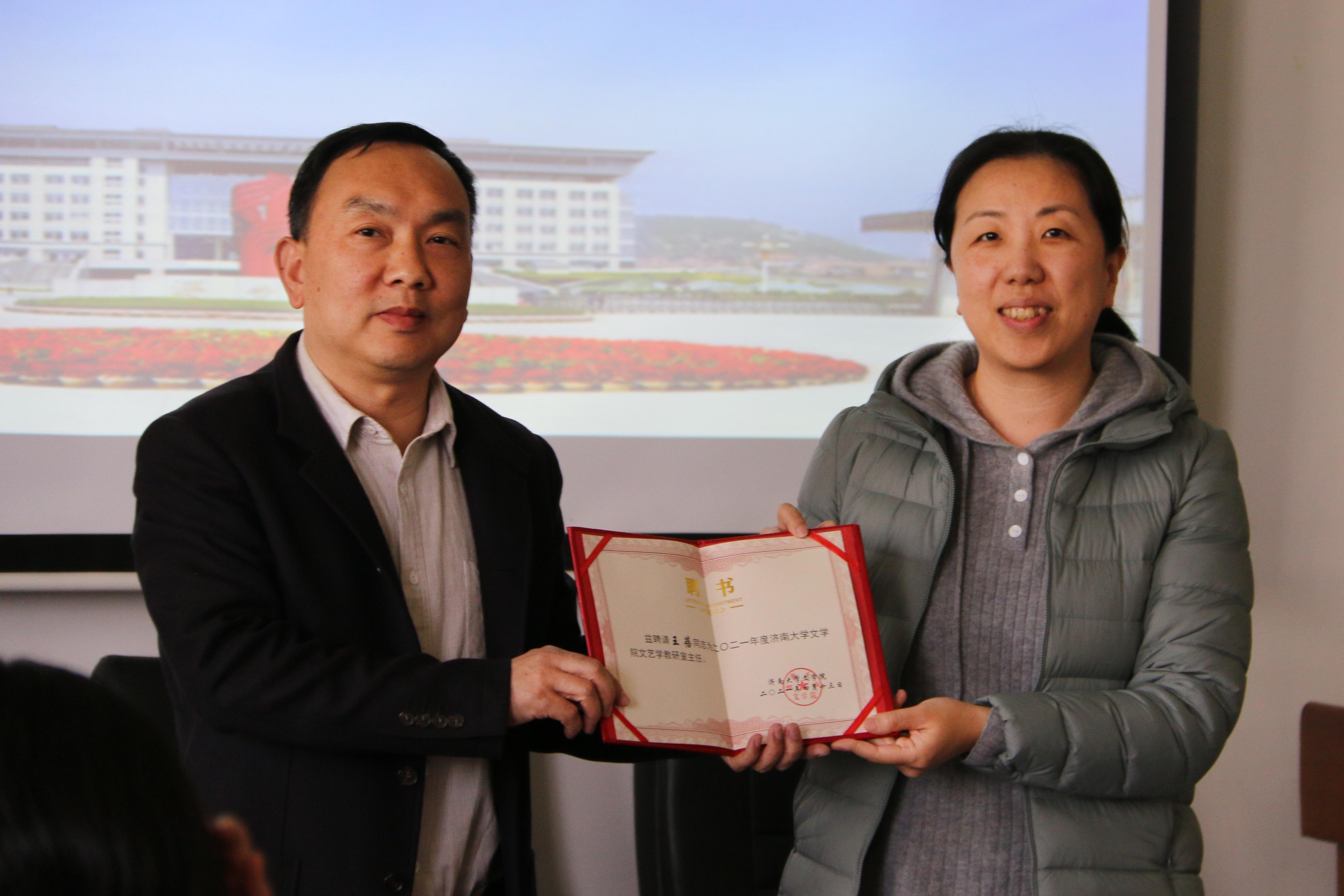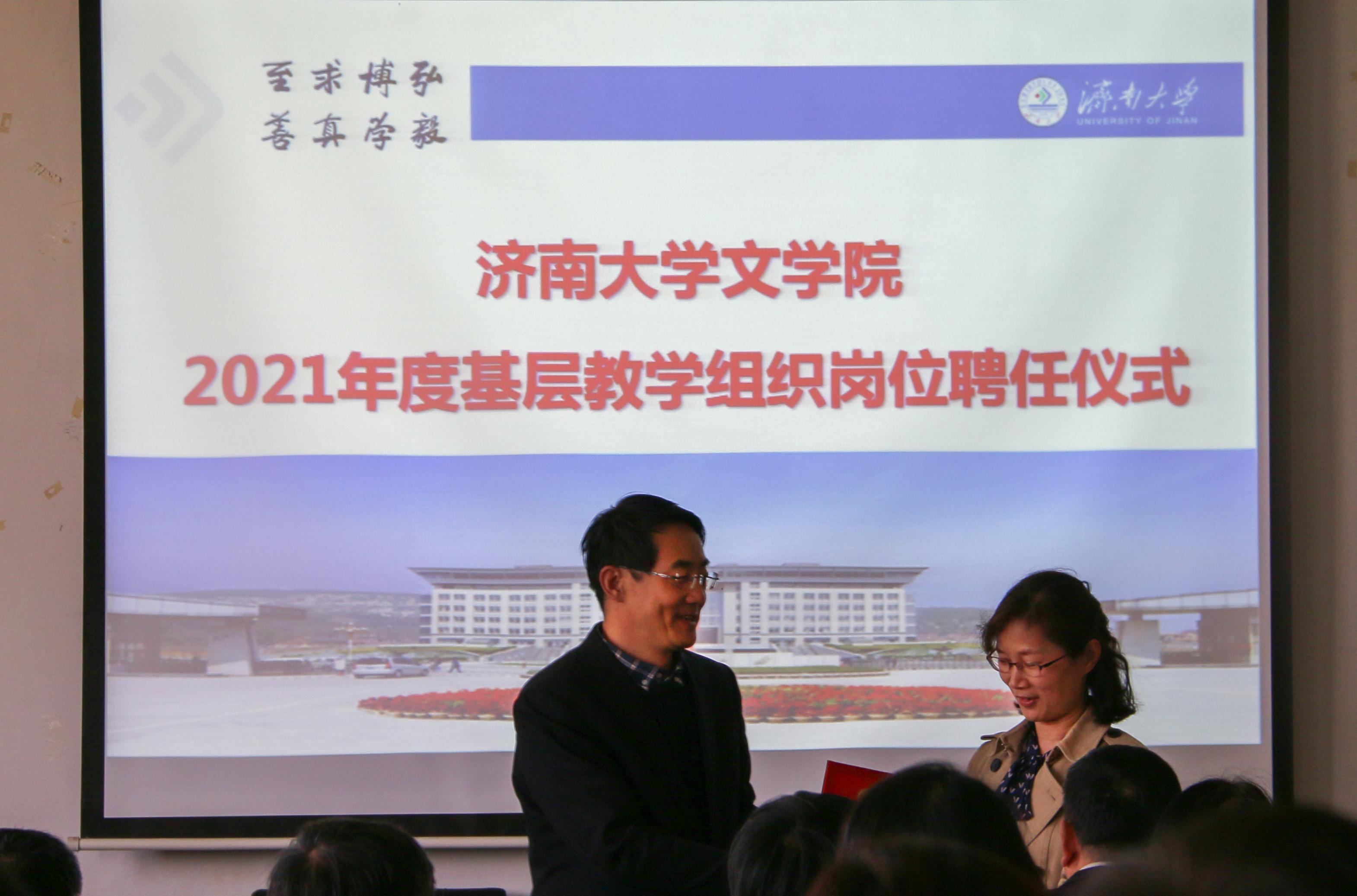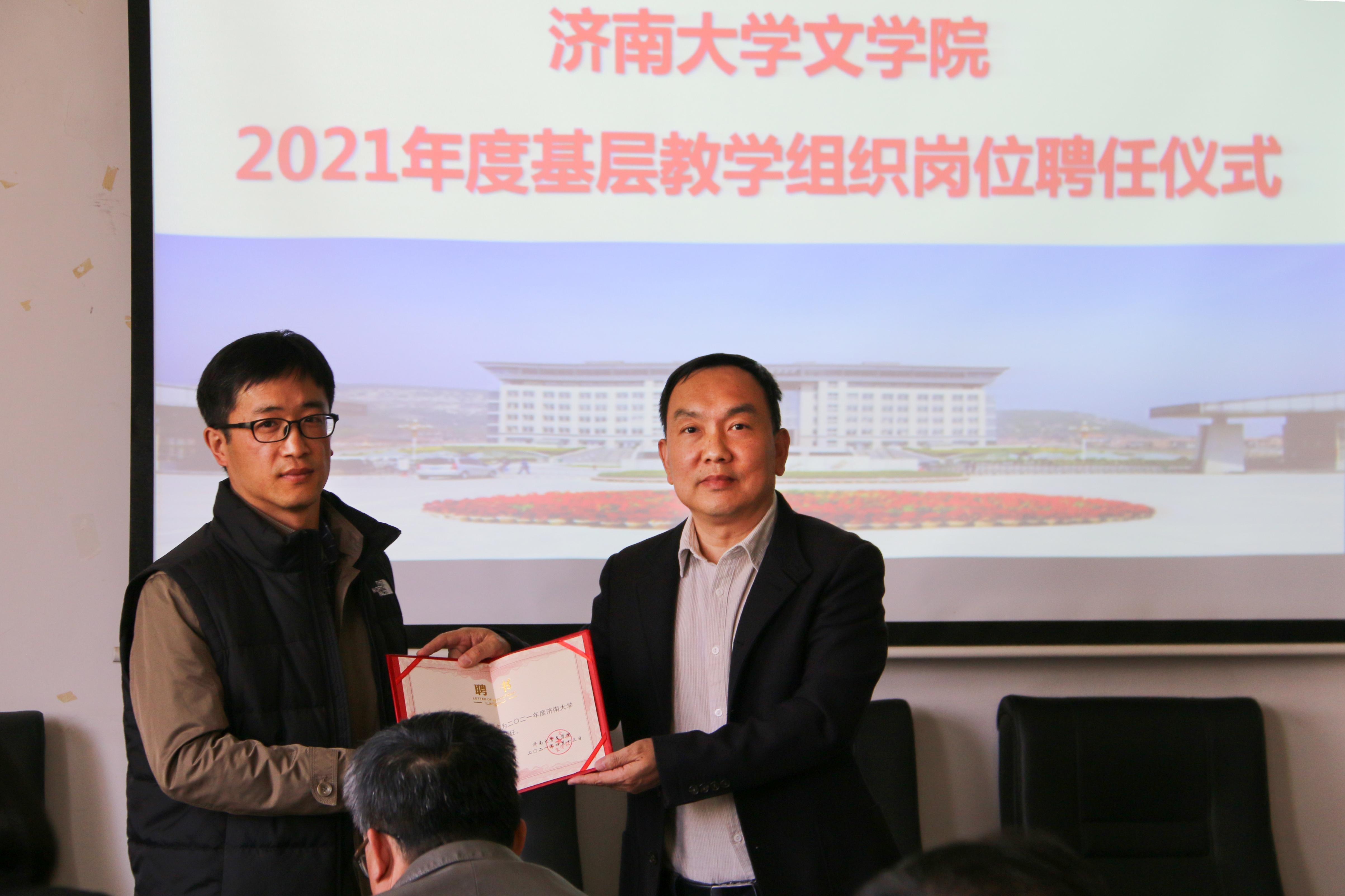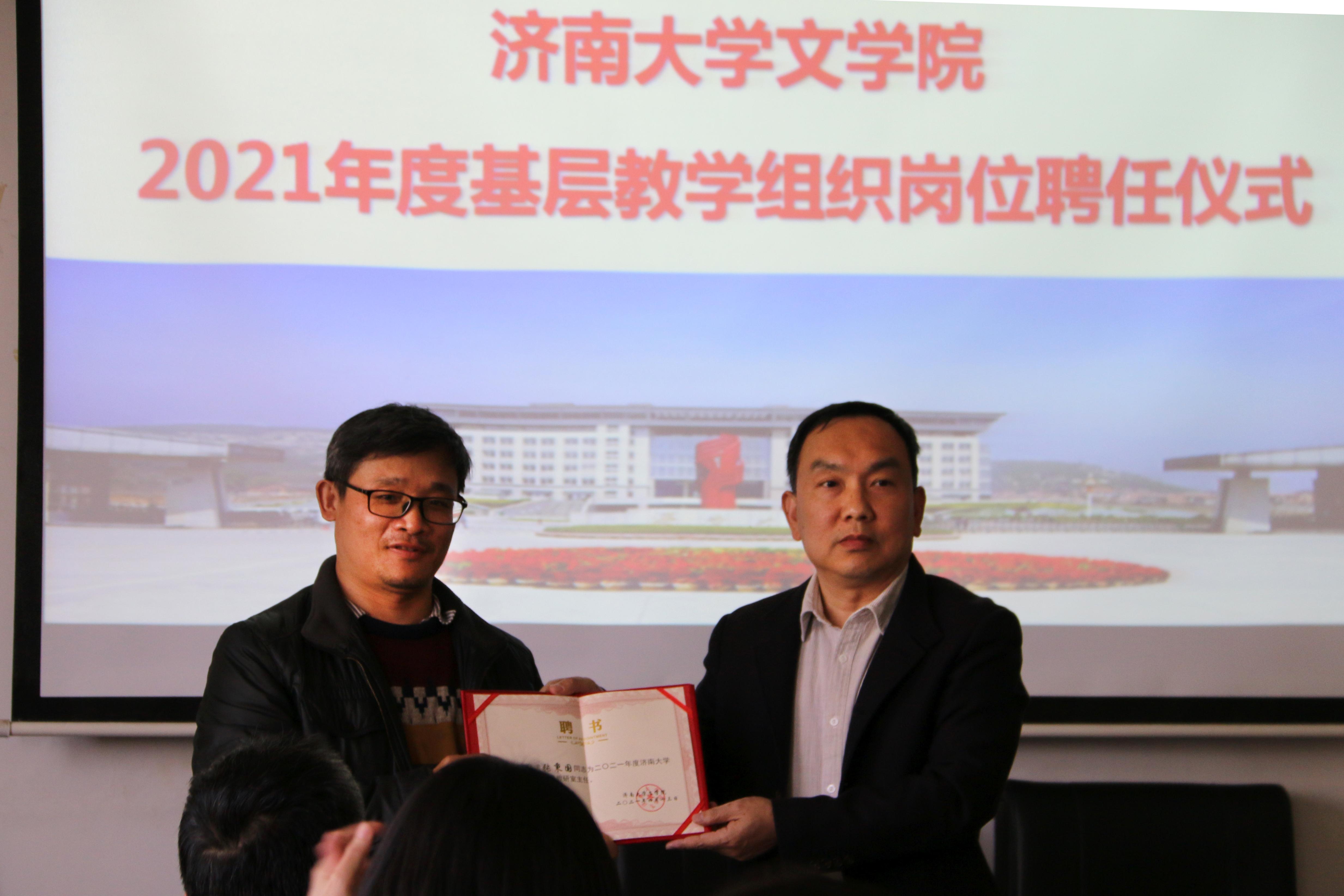 基层教学组织负责人聘任决定》,决定聘任王蓓等10人担任学院教研室主任、聘任蒋莹担任汉语言文学专业实践教学负责人,同时决定推荐张小平等4人分别担任汉语国际教育、广播电视学、广告学、编辑出版学专业负责人。随后,陈卫东书记、张兵院长分别向新聘任的教师颁发了聘书,并合影留念。至此,聘任仪式圆满结束。