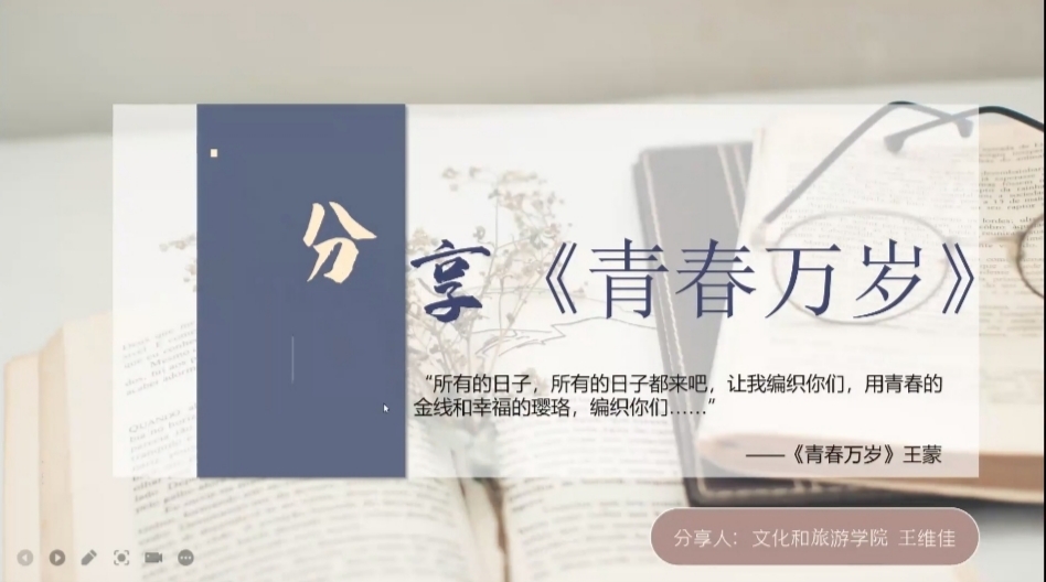 第六届读书节系列活动——“七彩济大”读书分享活动,本次活动邀请到文旅2107班王维佳同学在线上与同学们分享阅读《青春万岁》的心得体会。
