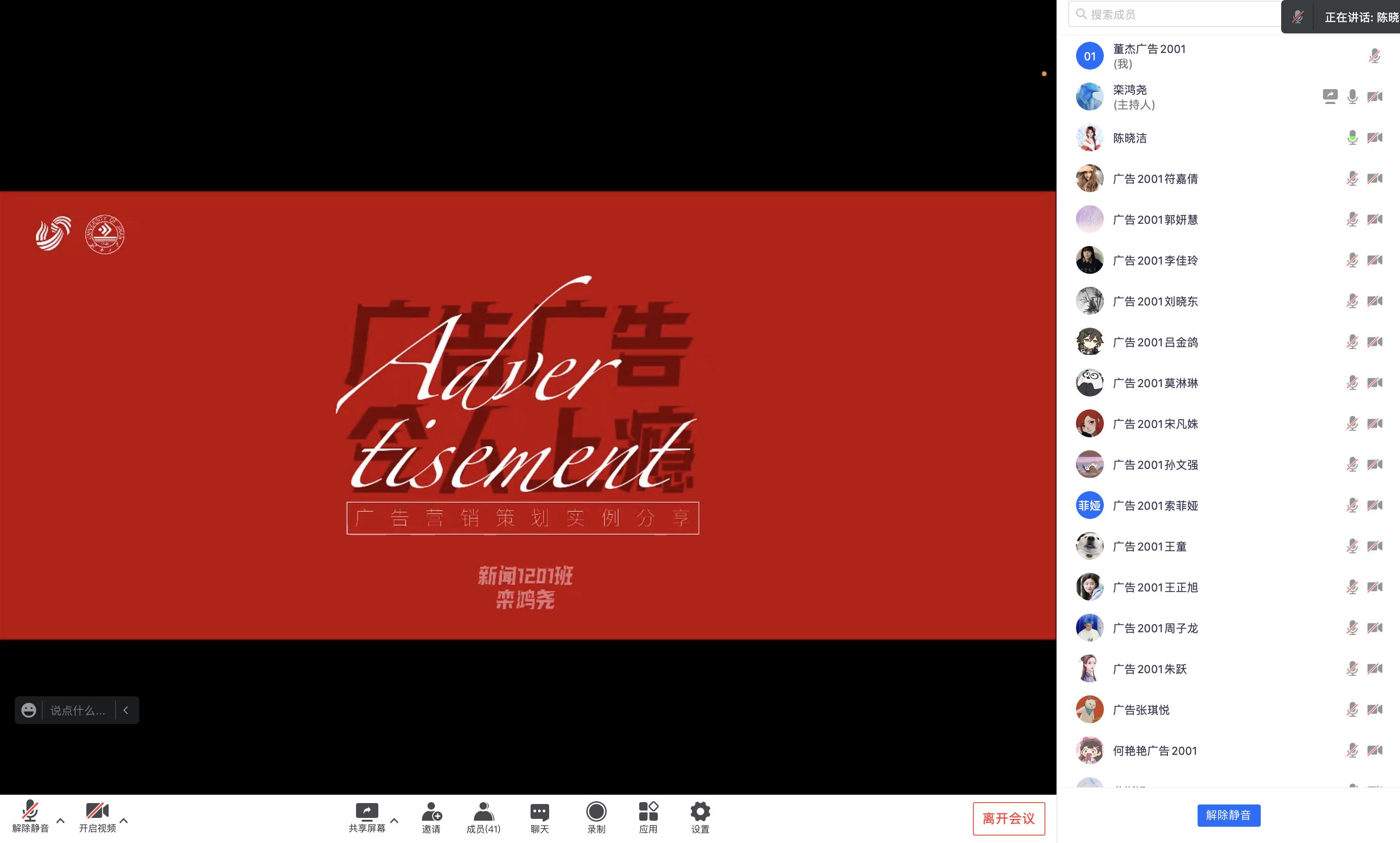 2022年5月3日晚8点,广告学专业邀请山东电视生活频道、农科频道融媒运营部副主任栾鸿尧先生为广告学专业学生作了题为“广告令人上瘾”的专题讲座,讲座围绕广告营销策划实例分享进行。广告学专业2020级、2019级学生积极参与,广告学专业陈晓洁、刘水清老师参会。