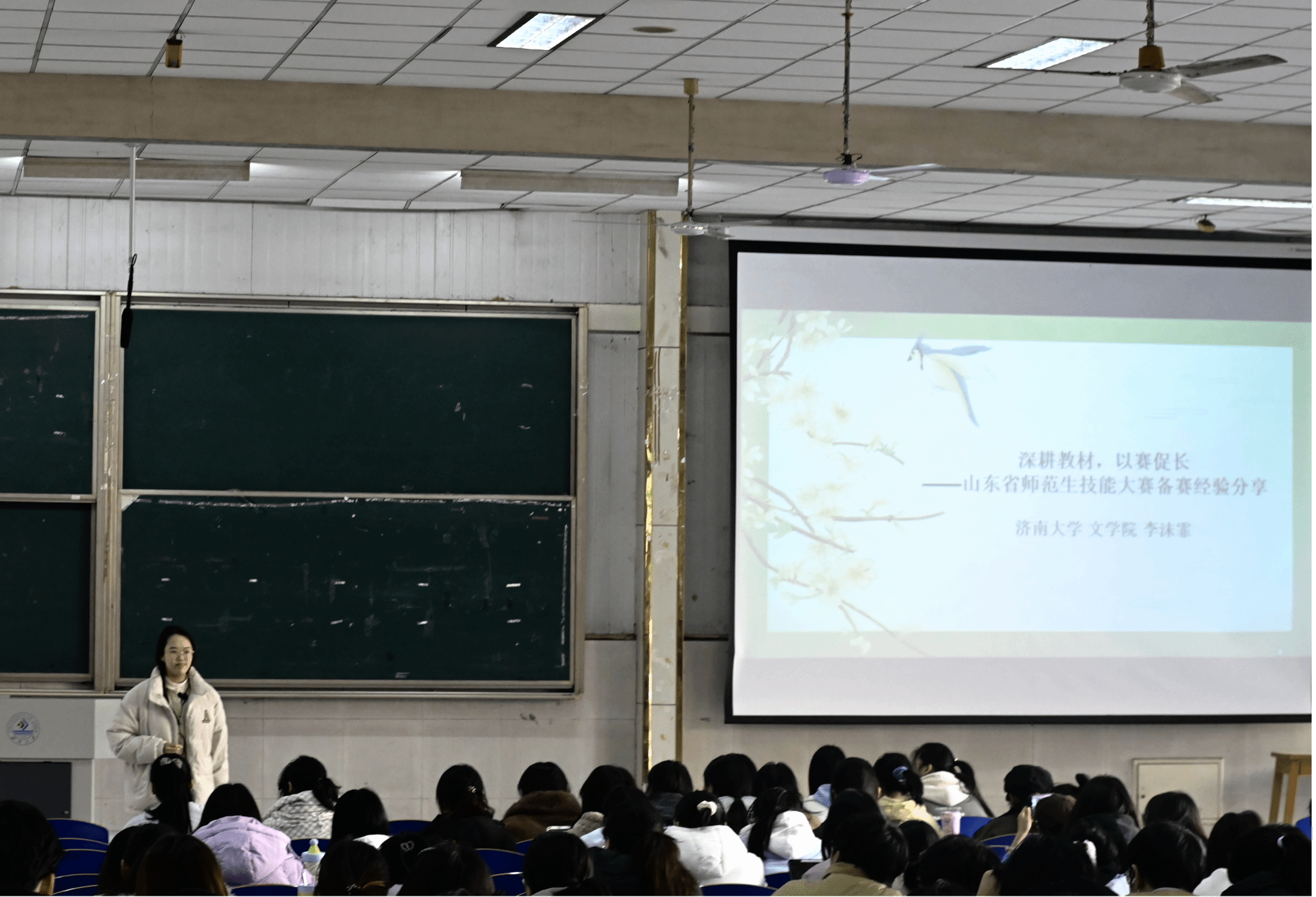 邀请了第十三届山东省师范类高校学生从业技能大赛小学组一等奖获得者李沫霏进行了经验分享。李沫霏以“深耕教材,以赛促长”为主题,结合自身备赛与参赛经历,对小学语文篇目教学设计进行了详细的讲解。她强调,备课时应跳出固定模板,以竞赛视角捕捉核心亮点,注重情境化设计,落实语文要素,确保教学流程完整、板书简洁。在技能方面,她指出脱稿授课、粉笔字书写、教姿教态的重要性。她提醒同学们应珍惜实习机会,在实践中培养快速备课的能力。此外,她还提到,备赛过程中难免会遇到瓶颈期,要秉持着“绵绵用力,久久为功”的态度,重视专业能力的系统梳理与提升,真正实现以赛促学、持续成长。