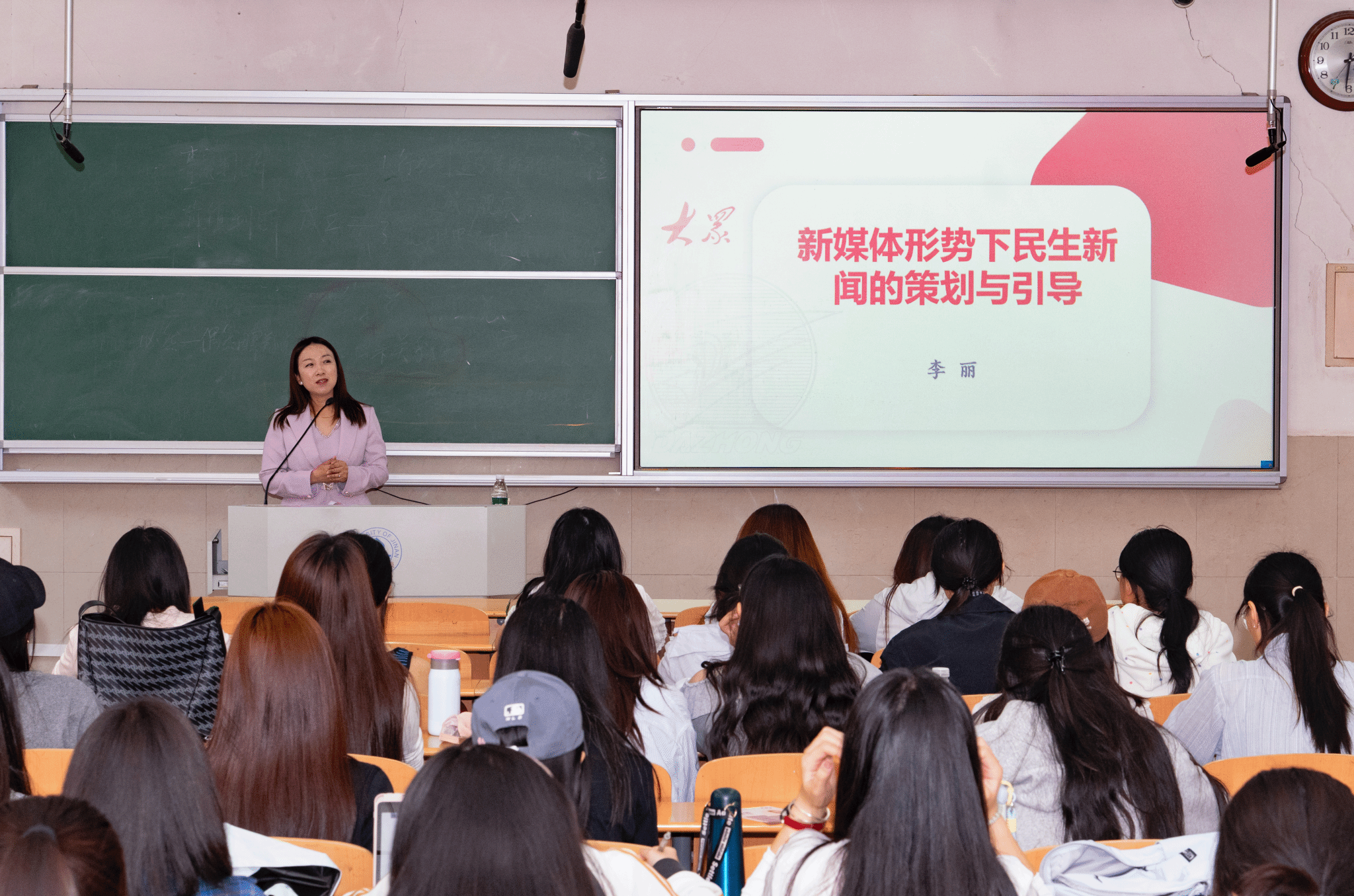 广播电视学专业“媒体人进校园” 系列讲座首场活动顺利举办。本次活动以“生涯面对面”为核心形式,特邀大众日报卫生记者站站长、大众日报大众健康版主编、健康山东云平台总监李丽,为2024级广电专业学生带来主题为《新媒体形势下民生新闻的策划与引导》的认知实习讲座。讲座由薛梦晨、丁捷老师主持。
