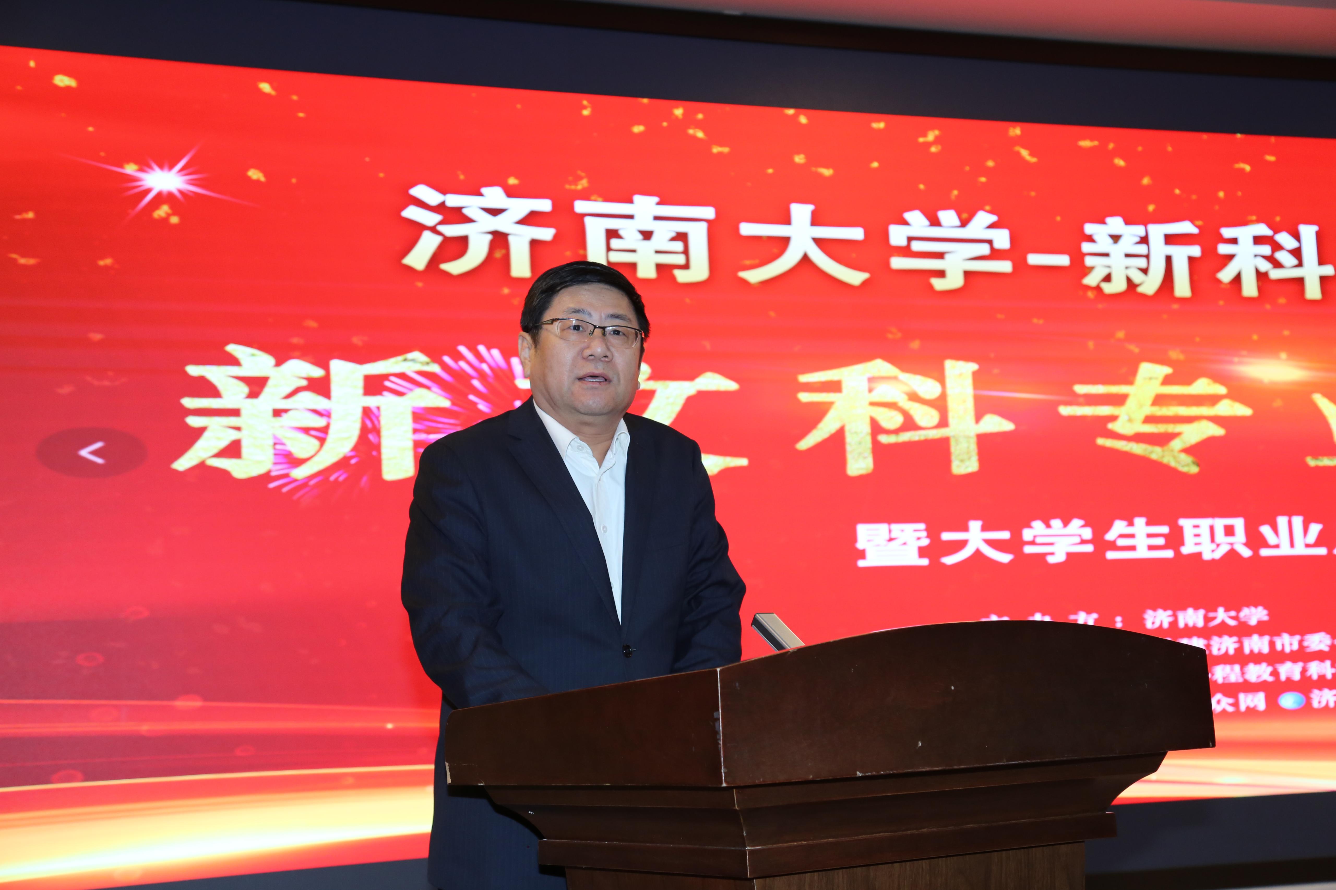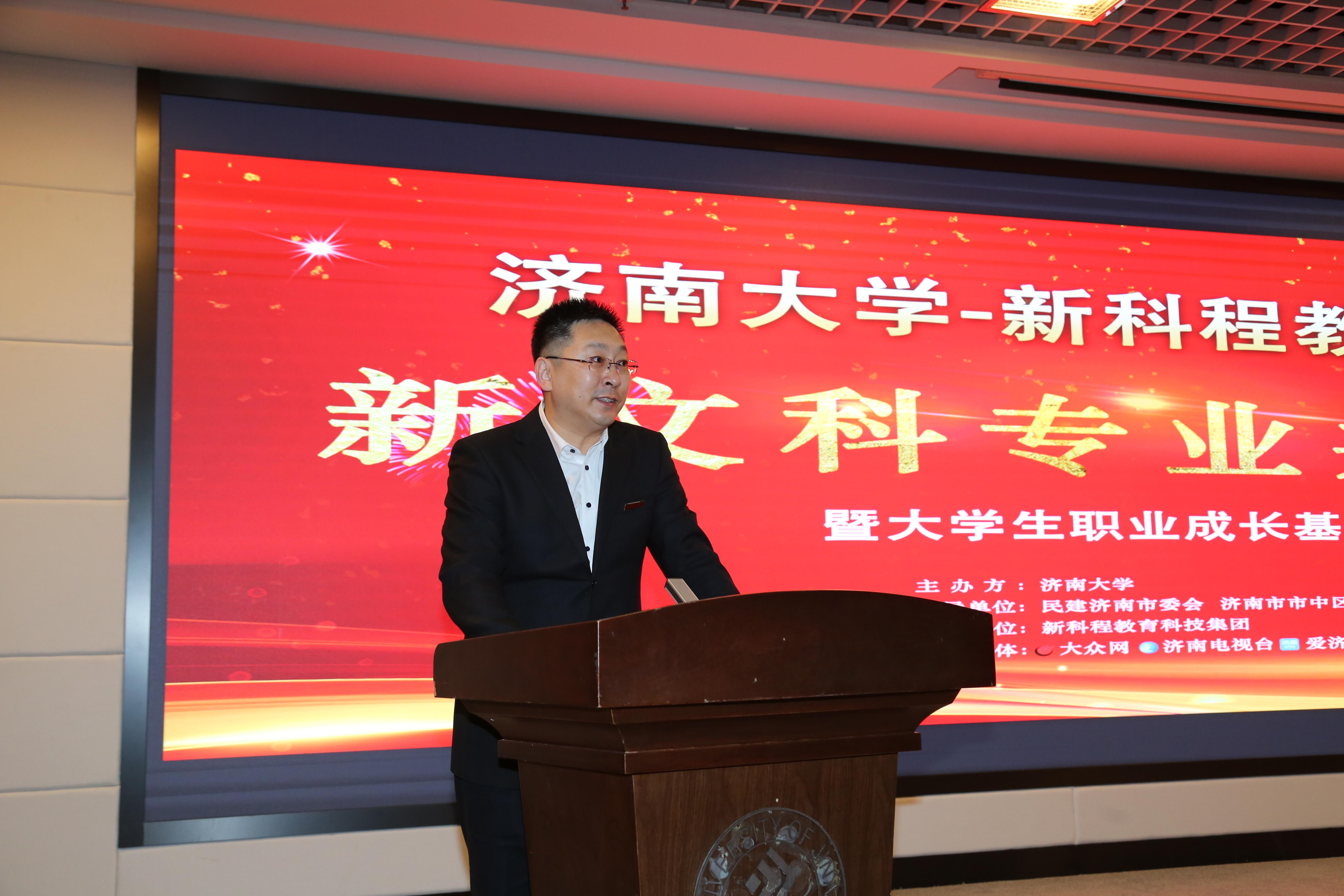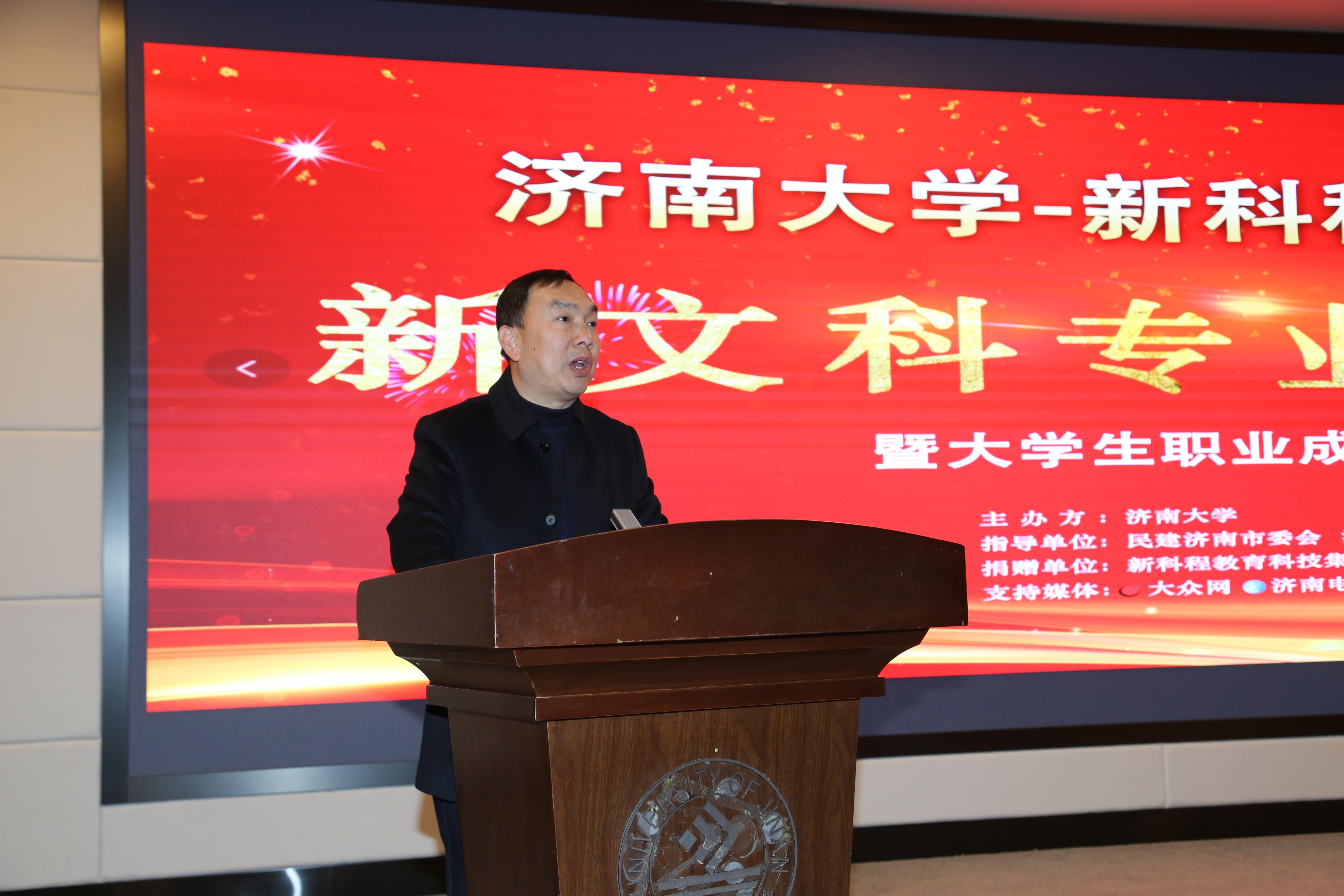 刘宗明副校长代表学校致辞,对民建济南市委会、市中区委统战部、新科程教育科技集团表示感谢,介绍了学校在人才培养、科学研究、社会服务、文化传承与创新、国际交流与合作等方面取得的成就。刘校长说,近两年,济南入选山东省高水平大学建设“冲一流”建设高校,核心发展指标均居省属高校前列,人才培养成效显著,获批一批国家一流专业、一流课程,新增一批博士、硕士学位授权点和专业学位类别。山东省一流学科、高峰学科、优势特色学科等建设加速推进,年度科研经费稳步增长,重大项目、平台和奖励取得突破,社会服务能力持续提升,产教融合发展全面起势,社会影响力和综合实力不断增强。同时,介绍了水果派av