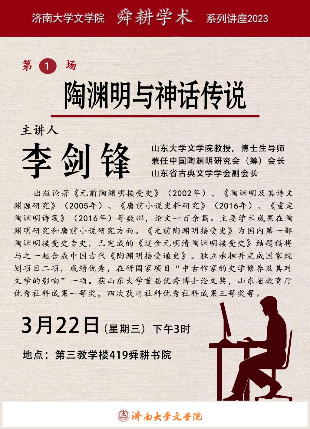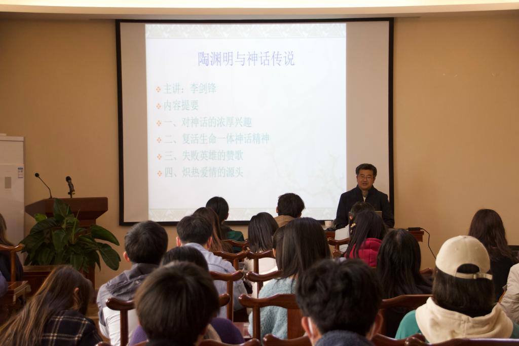 李剑锋教授首先指出陶渊明的诗文创作与神话传说有密切的关系,主要来自《山海经》和《穆天子传》,然后从生命一体神话精神的复活、失败英雄的赞歌、炽热爱情的源头三个方面,分别阐述了陶渊明的有关诗文与神话传说的精神联系。李教授表示陶渊明具有摆脱实用和理性束缚的审美态度,其诗歌努力恢复物我之间的情感交流,从感物、比物到拟人,其中物我融合的态度表现出审美的觉醒,达到了一种自觉的境界,可说是对物我一体神话精神的诗性继承。李教授指出陶渊明多次在诗文中赞颂夸父、精卫、刑天等神话人物,这几位人物都是失败的神话英雄,表明其摆脱了“成王败寇”的传统价值取向,折射出他借助原始神话的抗争精神以摆脱自己建功立业理想失败的心路历程。陶渊明《闲情赋》之“十愿”包含“敬”和“爱”两方面的炽热爱情,李教授认为,这种爱情不存在于传统的儒家思想和道家思想中,而应当从神话传说中探寻它的情感渊源。讲座接近尾声,李教授还总结了陶渊明和神话的其他关系:将神话传说中的幸福世界转换为桃源;从神话传说中汲取乐生拒死的精神力量。此外,李剑锋教授还就中国古代学学术论文写作规范与科研诚信做了详细介绍与讲解。