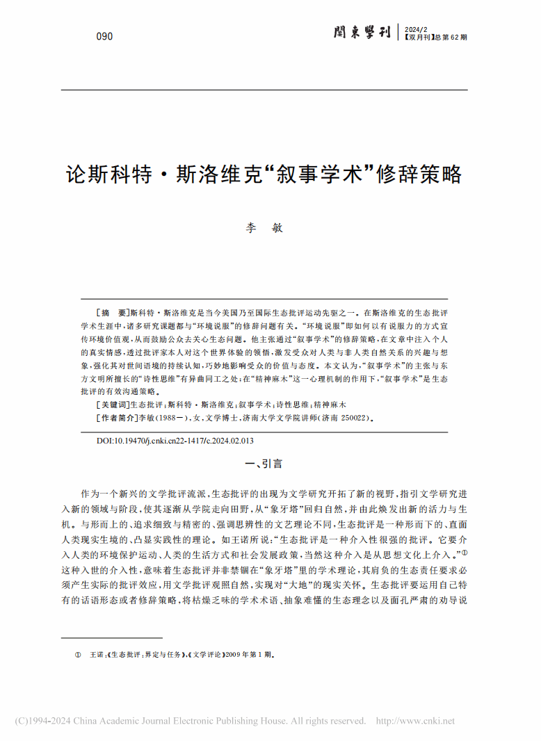 我院李敏博士的论文《论斯科特·斯洛维克“叙事学术”修辞策略》于《关东学刊》2024年第2期发表。