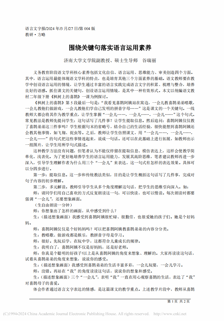 我院谷瑞丽副教授的文章《围绕关键句落实语言运用素养》于2024年3月27日在《语言文字报》发表。
