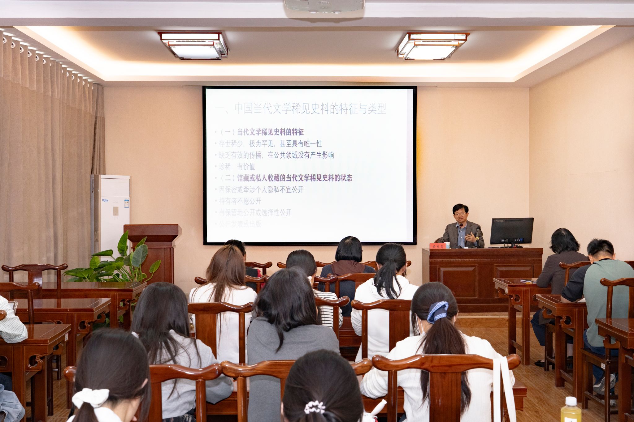 讲座伊始,黄发有教授就中国当代文学稀见史料的研究背景做了简要介绍,回顾了其收藏稀见史料的心路历程。接着,黄教授就中国当代文学稀见史料的特征、馆藏或私人收藏的当代文学稀见史料的状态、当代文学稀见史料的类型等做了总体报告,并指出要重视口述史料、图像史料和网络史料等重要类型。