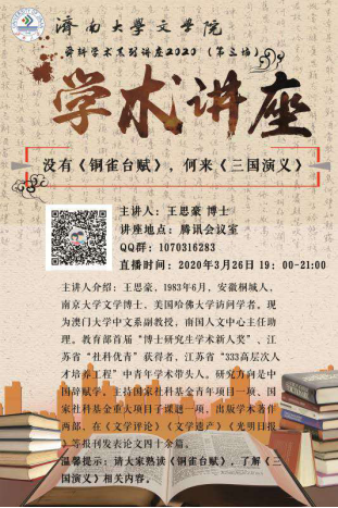 “舜耕学术系列讲座2020”第三场如期举行。哈佛大学访问学者、澳门大学中文系副教授、南国人文中心主任助理王思豪主讲,围绕《没有<铜雀台赋>,何来<三国演义>》展开。讲座采用腾讯直播的形式,水果派av