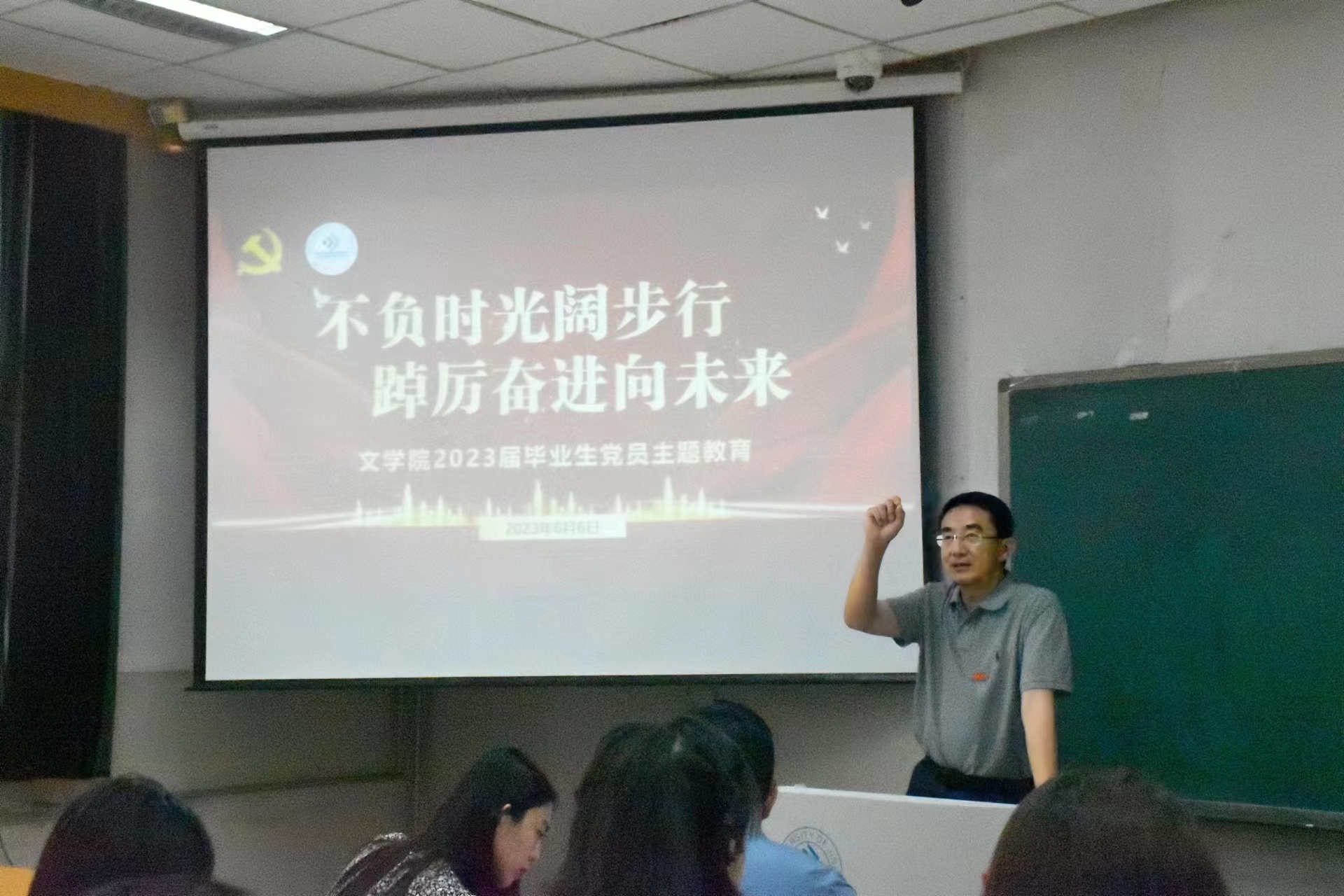 在第十教学楼101教室召开“不负时光阔步行,踔厉奋进向未来”毕业生党员教育大会暨“同上一堂思政大课”毕业生思政主题教育会议,会议由学院党委副书记孙成政主持,学院党委书记陈卫东、学生工作办公室相关老师、全体毕业生党员共同参加。