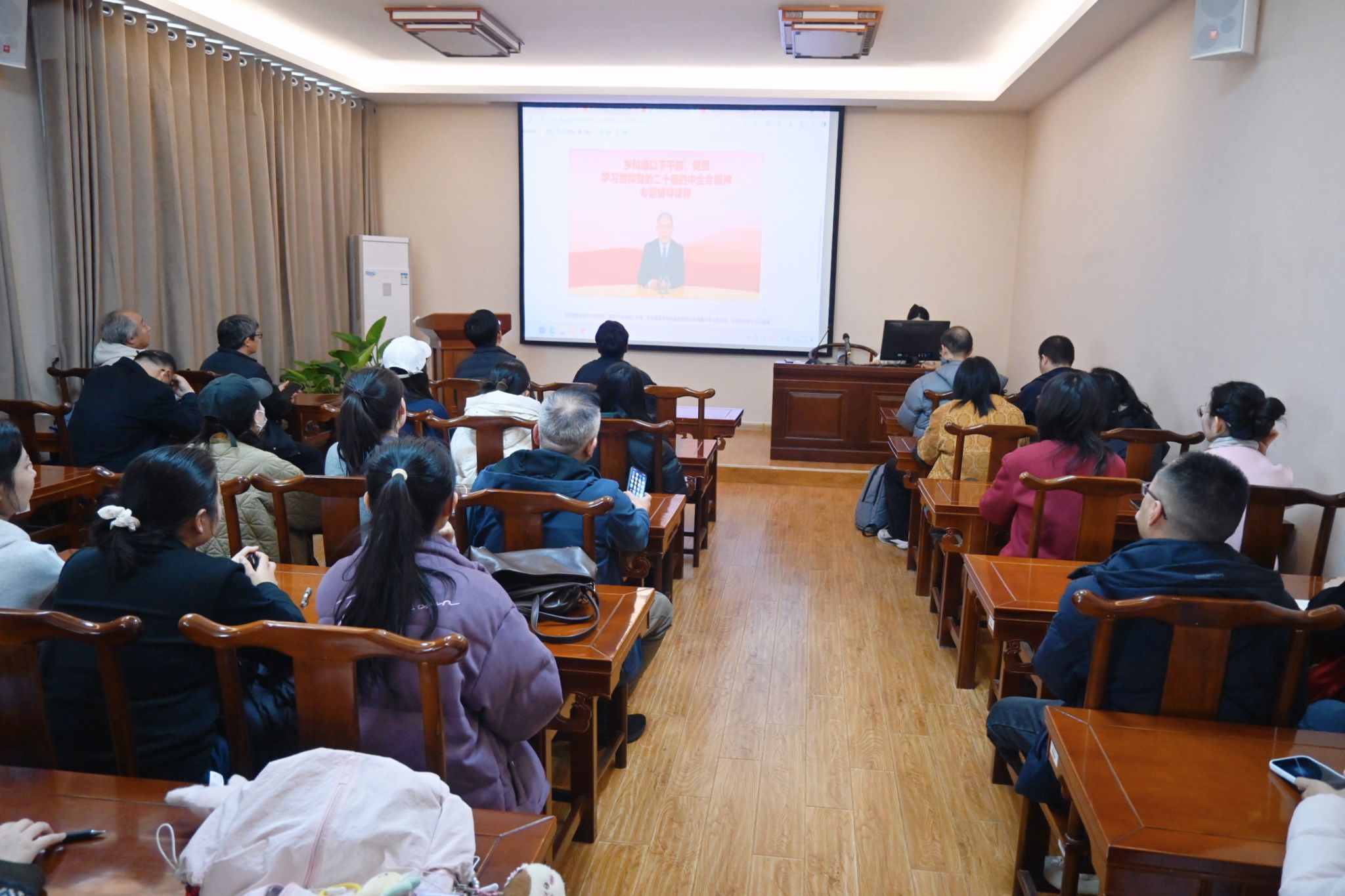 党委在三教舜耕书院组织开展科级及以下干部、党员学习贯彻党的二十届四中全会精神专题培训,学院全体科级及以下干部、党员参加培训。