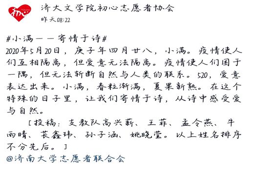 活动自5月16日正式开始,通知下达后,志愿者们积极响应,踊跃报名参加。活动前期,大家分别选定各自投稿内容侧重的主题,广泛搜集与自然和爱相关的诗歌素材与图片,运用制图软件将其组合进行创作,寄情于诗,从诗中感受爱与自然。活动后期,志愿者们上交作品,由轮值队长进行整理与完善,向初心志愿者公众号投稿。最后,活动成果在水果派av