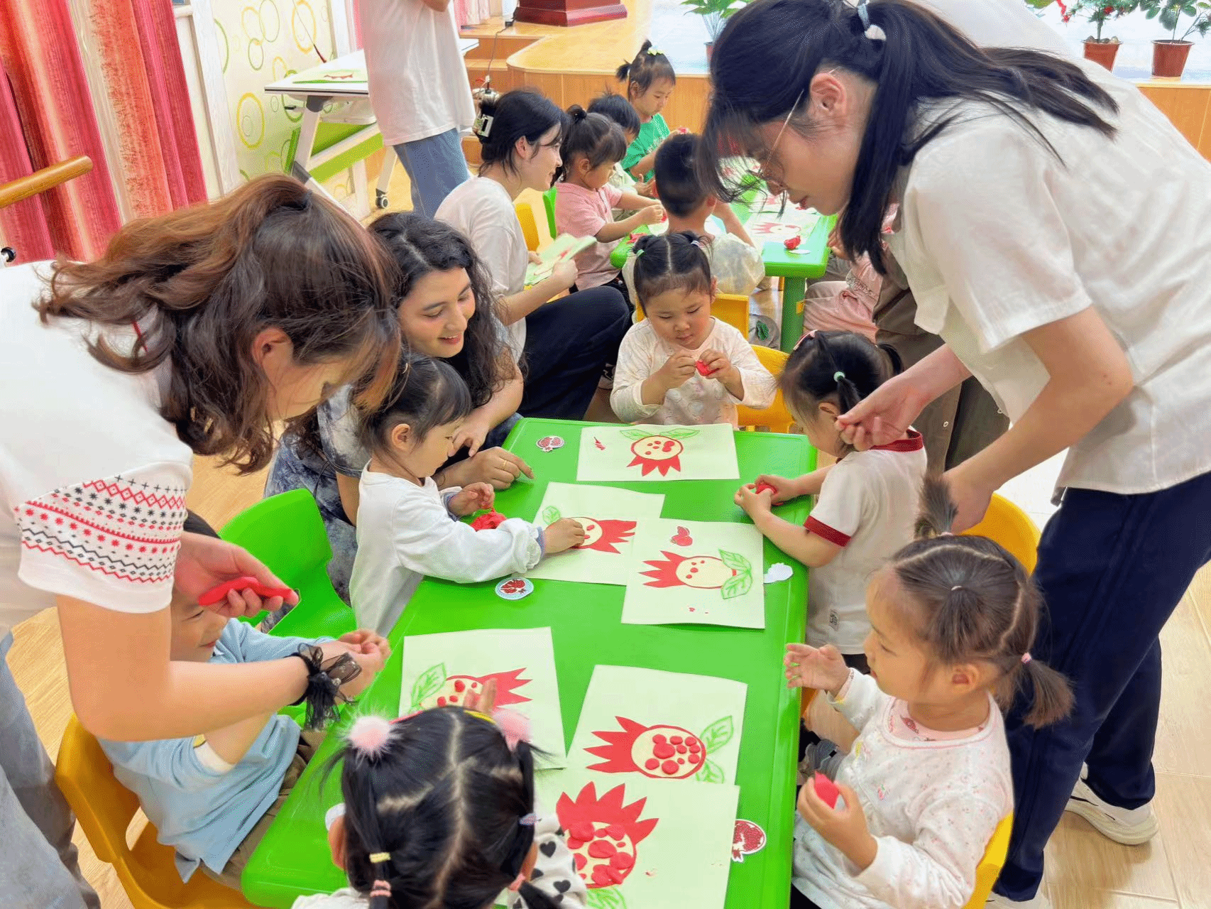 本次活动以铸牢中华民族共同体意识为核心,通过一系列富有特色的活动,让孩子们在轻松愉快的氛围中感受到了中华民族的多元魅力。石榴籽团队为小朋友们带来了特色手工制作项目,首先由历史2101学生米热阿依向幼儿园小朋友们介绍中华民族以及常见的少数民族文化;随后石榴籽团队向小朋友们发放了精心准备的石榴花贴纸;活动最后,在幼儿园老师们的帮助下,石榴籽团队组织幼儿们拿起彩色纸将自己对于民族特色文化的理解与喜爱粘贴成了一张张美丽的石榴花手工画。这些手工画精致且色彩丰富,表达了“中华民族一家亲,同心共筑中国梦”的美好愿望,描绘了在党的领导下,各民族像石榴籽一样紧紧拥抱在一起。