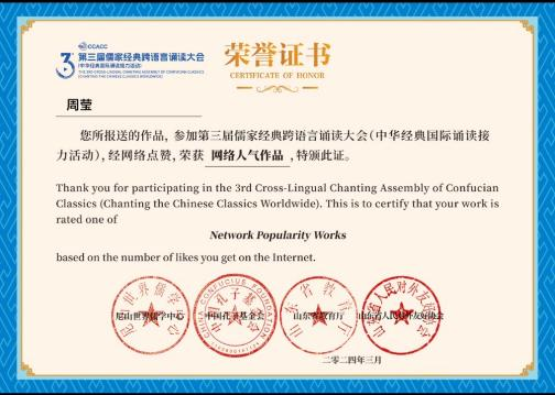 第三届儒家经典跨语言诵读大会荣获“银奖”