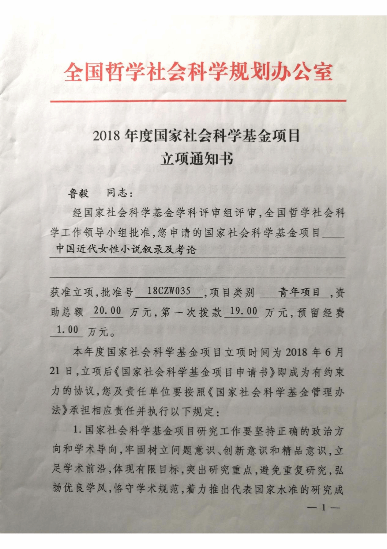 鲁毅教授主持完成的国家社会科学基金项目“中国近代女性小说叙录及考论”(项目批准号为:18CZW035),最终成果为专著《中国近代女性小说叙录及考论》。