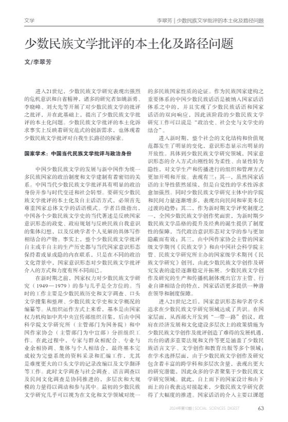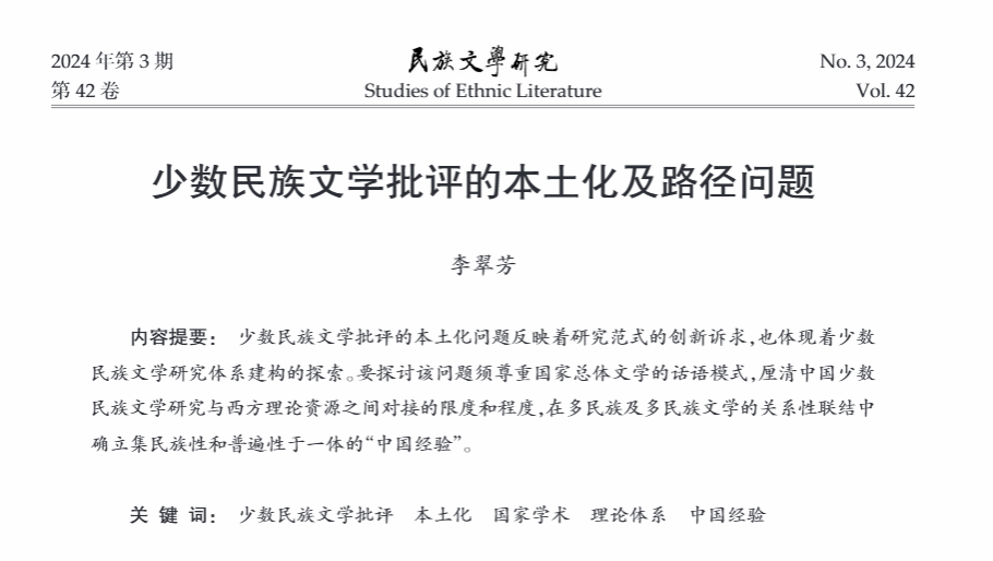 近日,我院李翠芳教授在《民族文学研究》(CSSCI)2024年第3期上发表学术论文《少数民族文学批评的本土化及路径问题》。该论文系国家社会科学基金一般项目“中国少数民族红色文学经典的生产机制研究”(22BZW187)的重要阶段性成果。该文章被《社会科学文摘》2024年第10期全文转载。